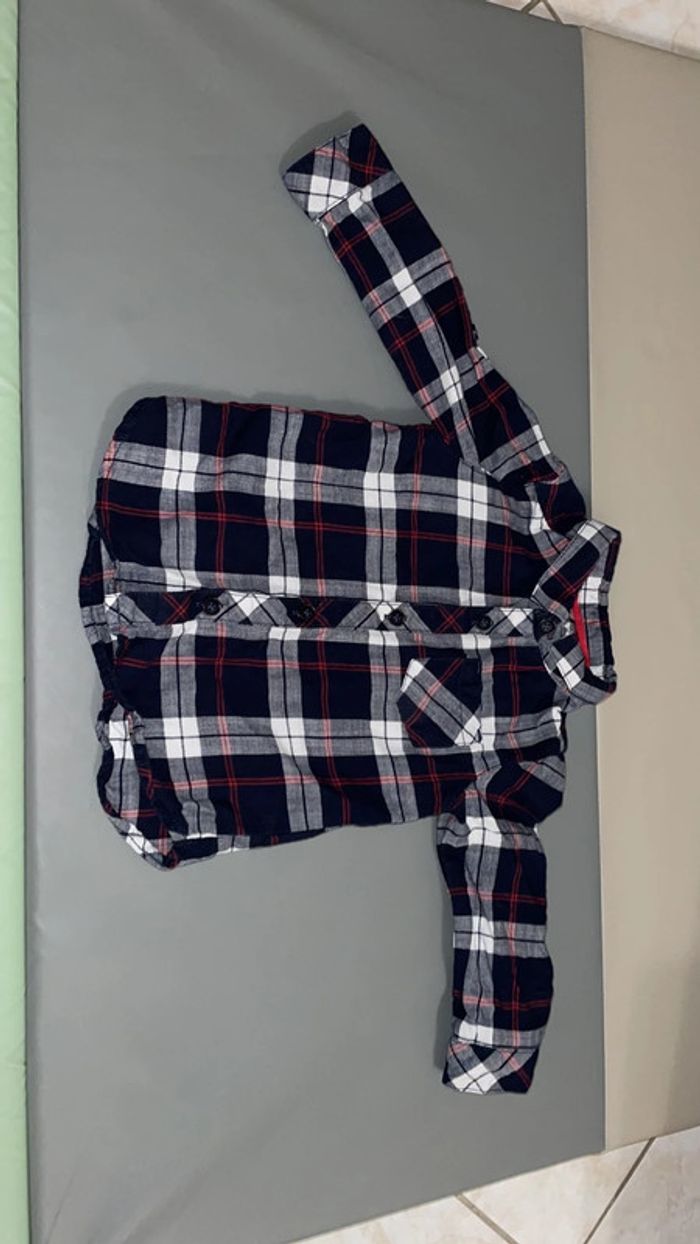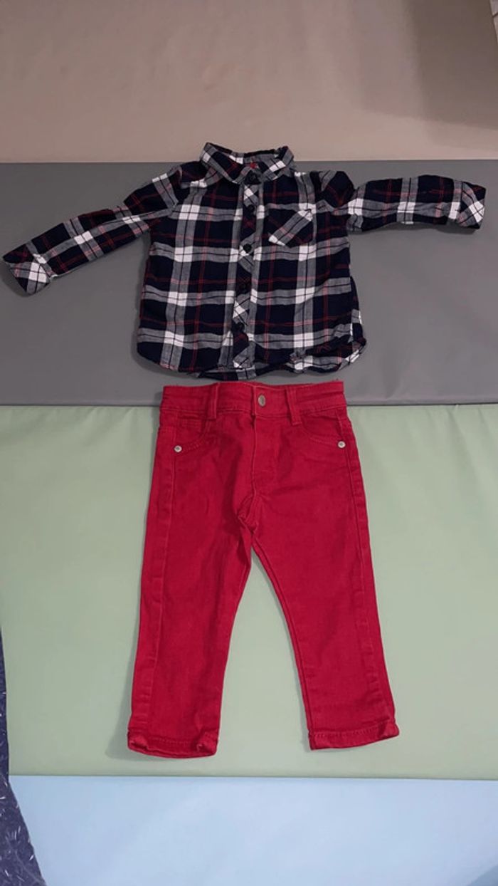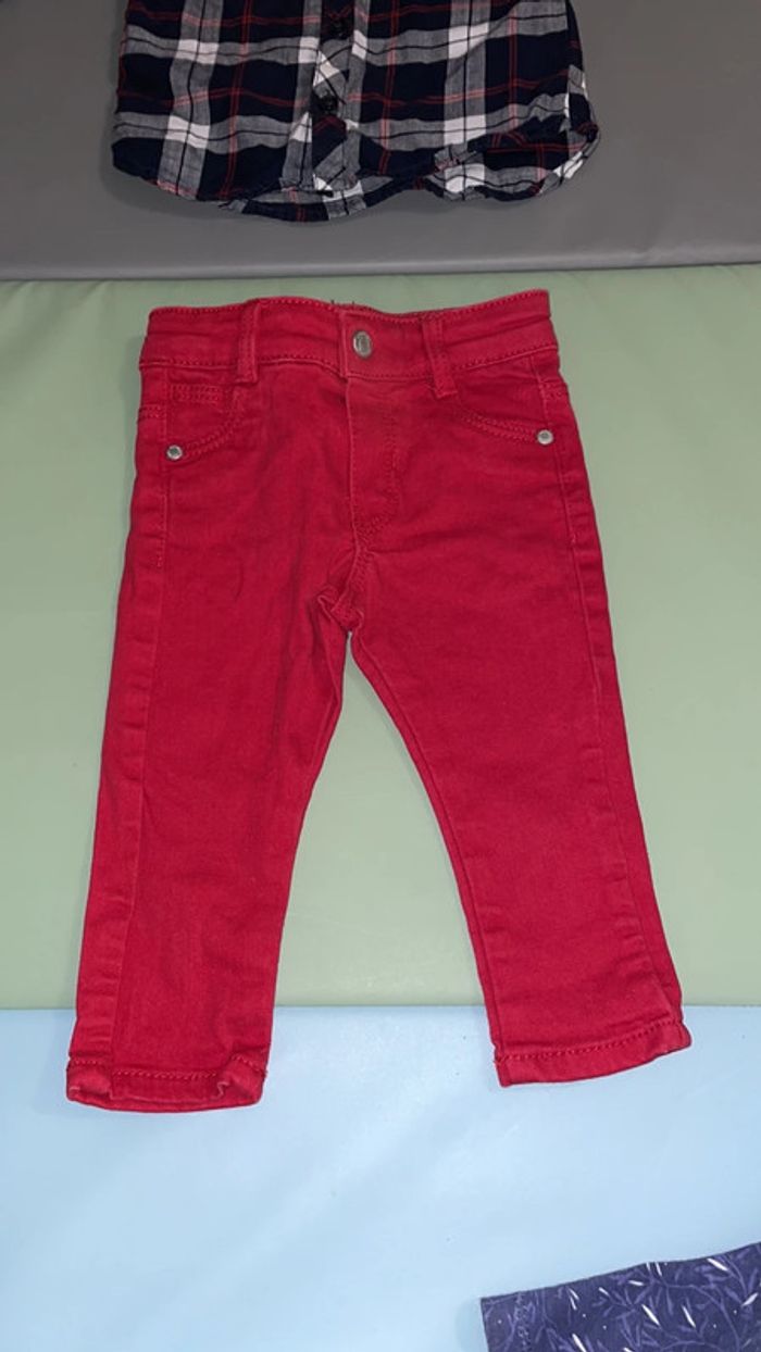 Lot 6 mois composé d’un jean bordeaux et d’une chemise à carreaux marine, blanc et bordeaux. Excellent état #dressingdeMilo6moisgarçon