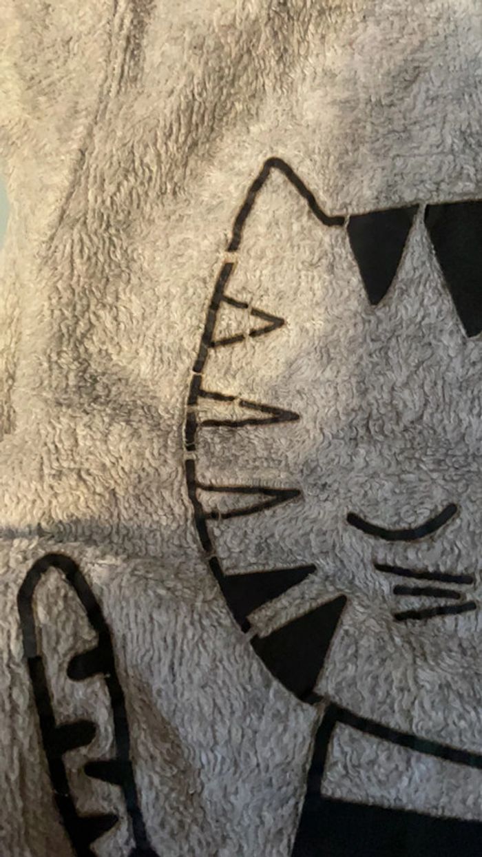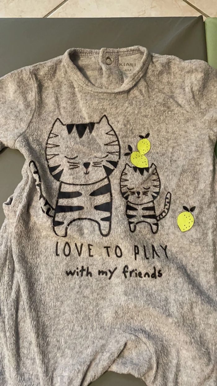 Pyjama 6 mois mixte, couleur gris, motif chat, fermeture à l’arrière par pressions. Très bon état si ce n’est le dessin qui craquelle légèrement (cf. Photo) #dressingdeMilo6moisgarçon