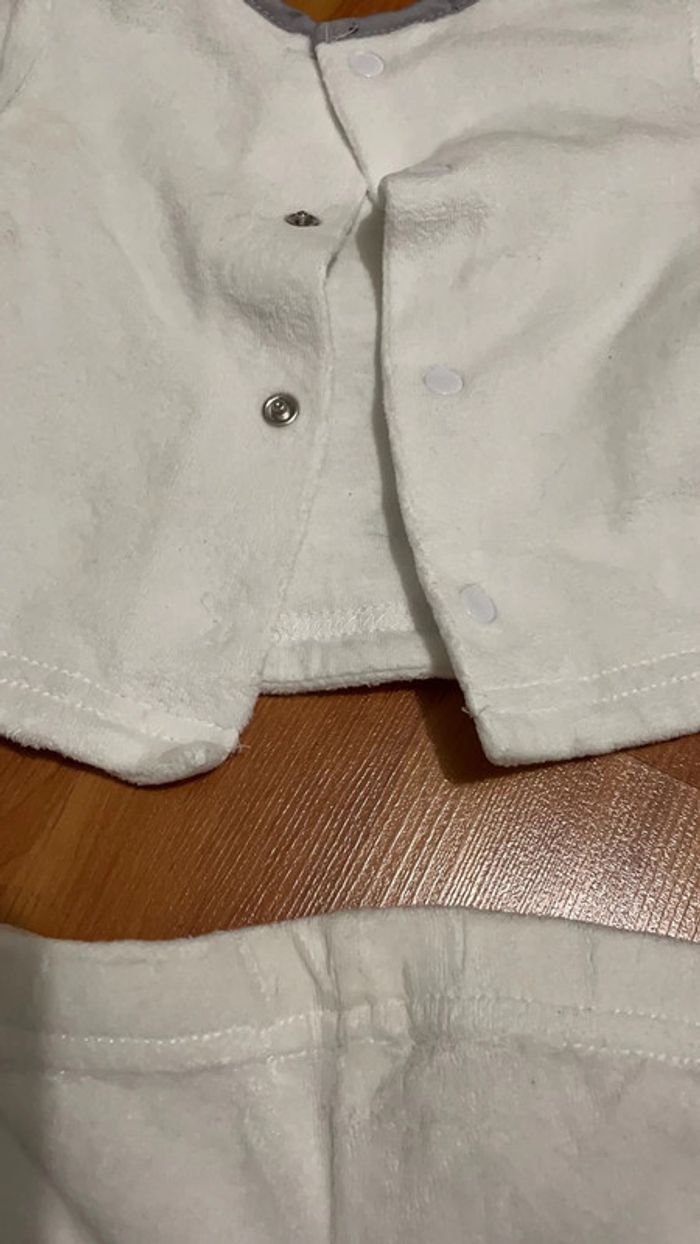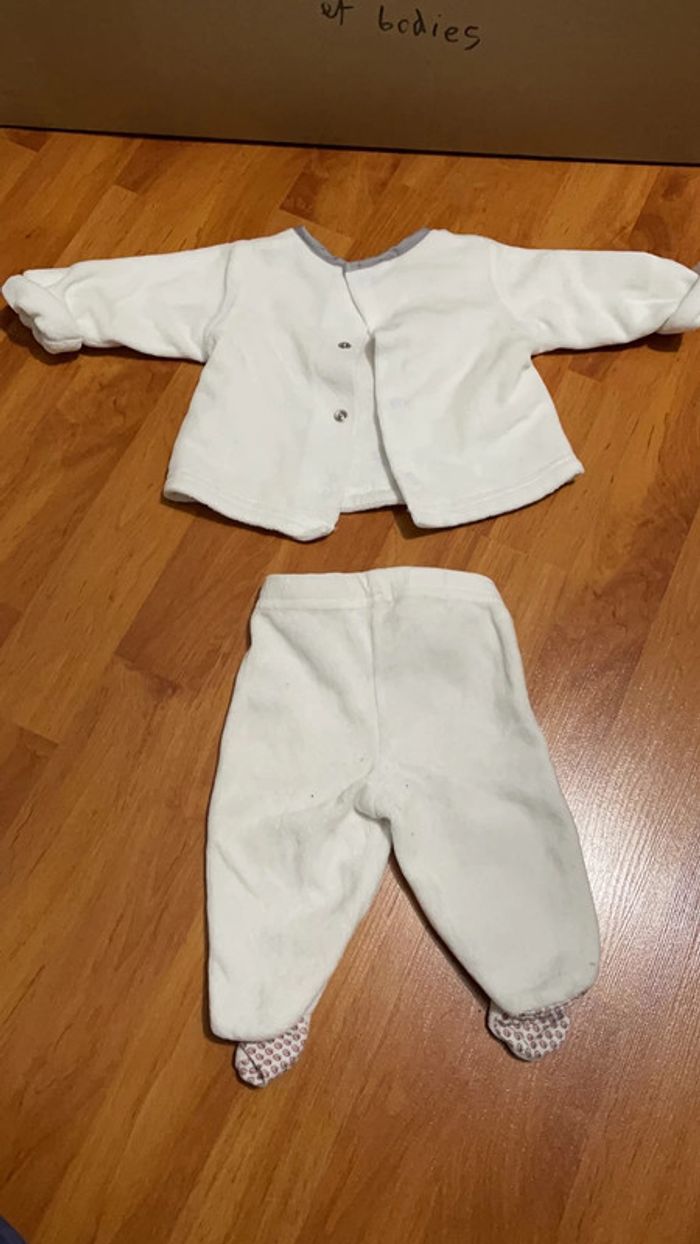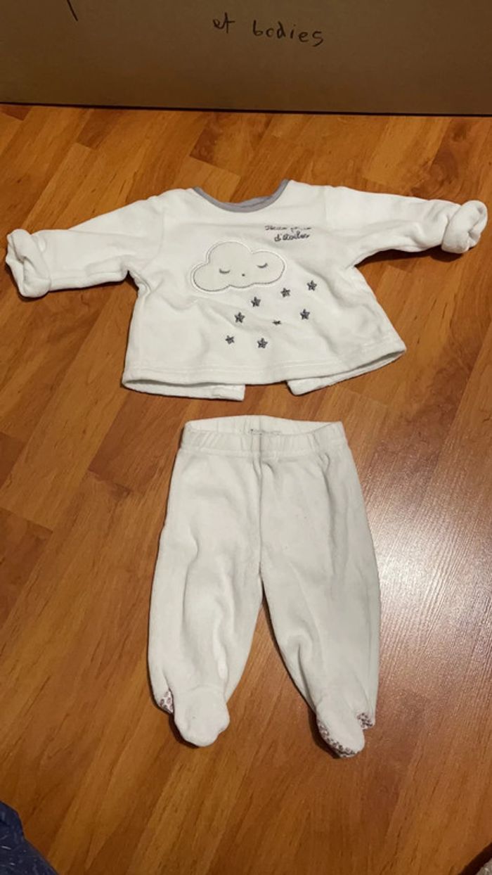 Ensemble 1 mois composé d’un haut épais qui se ferme à l’arrière et d’un bas avec pieds intégrés. Attention le haut à perdu une pression en bas (cf. photo) #dressingdeMilo1moisgarçon