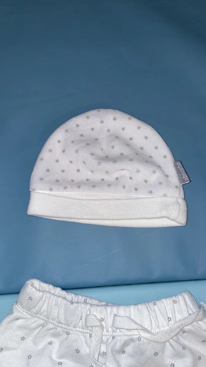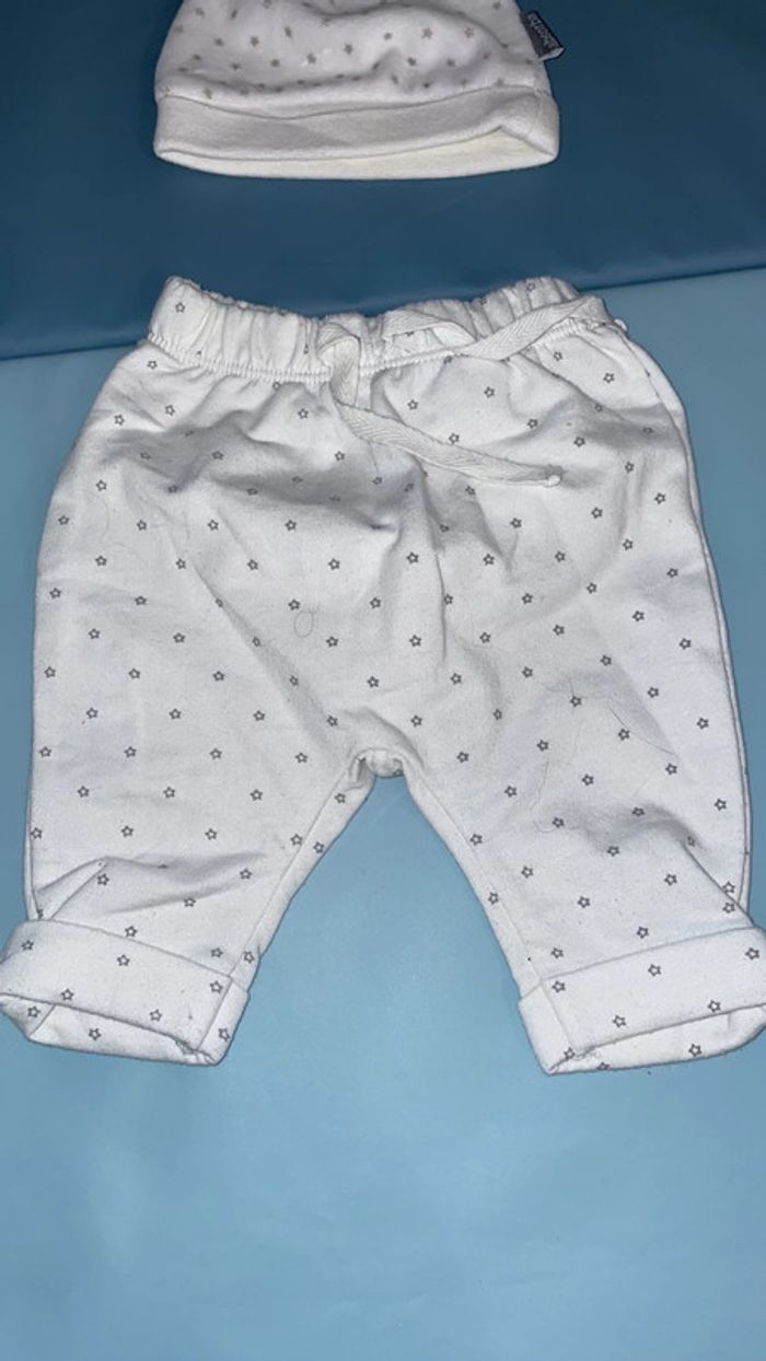 Ensemble mixte composé d’un pantalon style jogging et d’un bonnet chaud le tout blanc motif étoiles grises 1 mois Excellent état #dressingdeMilo1moisgarçon