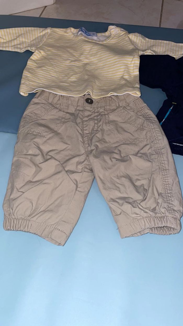 Ensemble 1 mois composé d’un pantalon beige, d’un haut blanc et jaune à rayures et d’une veste Winnie l’ourson bleue marine et jaune. Différentes marques : Kitchoun, Prends ton pouce, Disney baby. Excellent état. #dressingdeMilo1moisgarçon