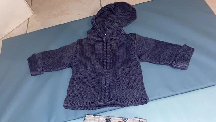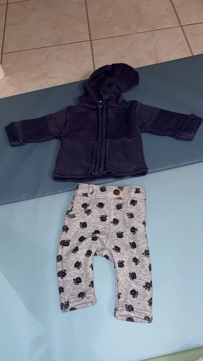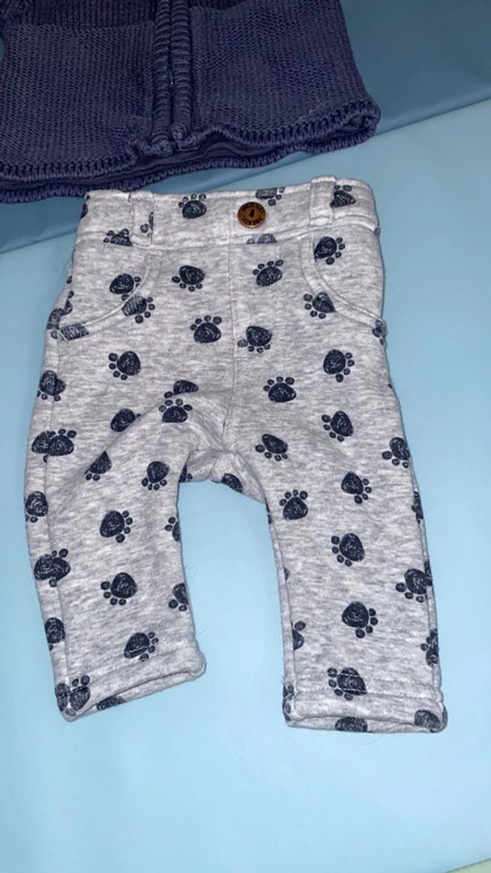 Ensemble 1 mois composé d’un pantalon gris avec des pattes de chien bleues et d’un gilet en laine à capuche avec fermeture éclaire. Très bn état #dressingdeMilo1moisgarçon