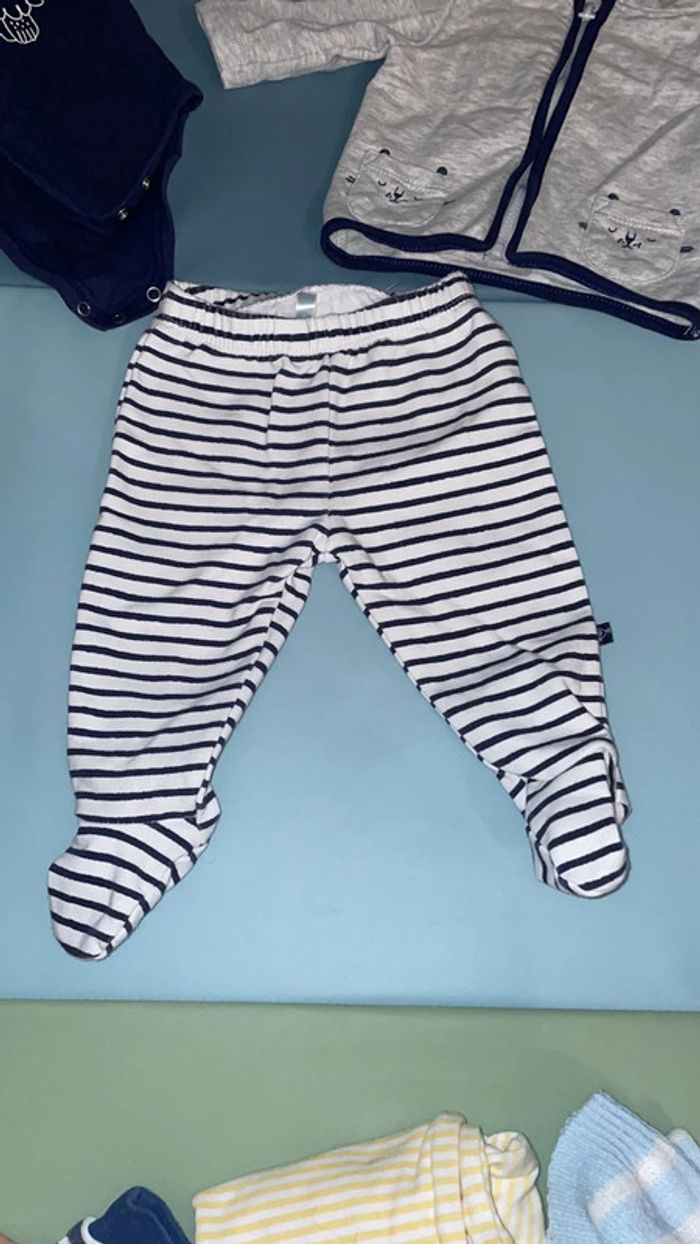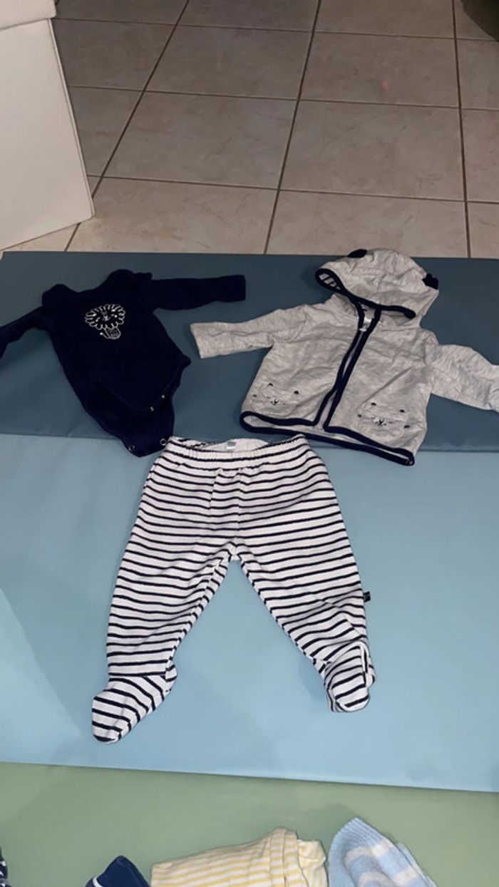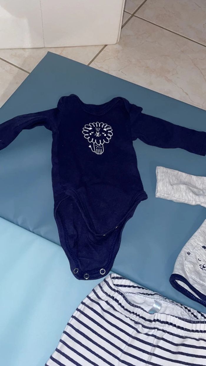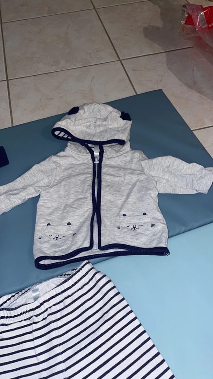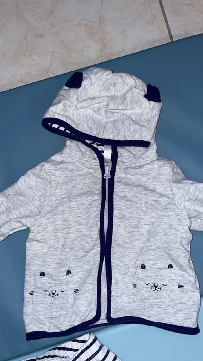 Ensemble 0-1 mois composé d’un body, d’un pantalon avec pieds et d’une veste à capuche (petites oreilles sur la capuche) Excellent état #dressingdeMilo1moisgarçon