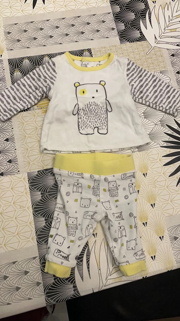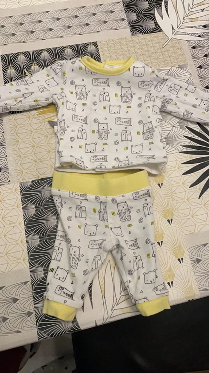 Ensemble naissance avec haut (fermeture par pressions à l’arrière (voir photo) et pantalon assorti. Tout est réversible. 4 combinaisons possibles. Couleur blanc et jaune. Excellent état, très peu porté. #dressingdeMilonaissance