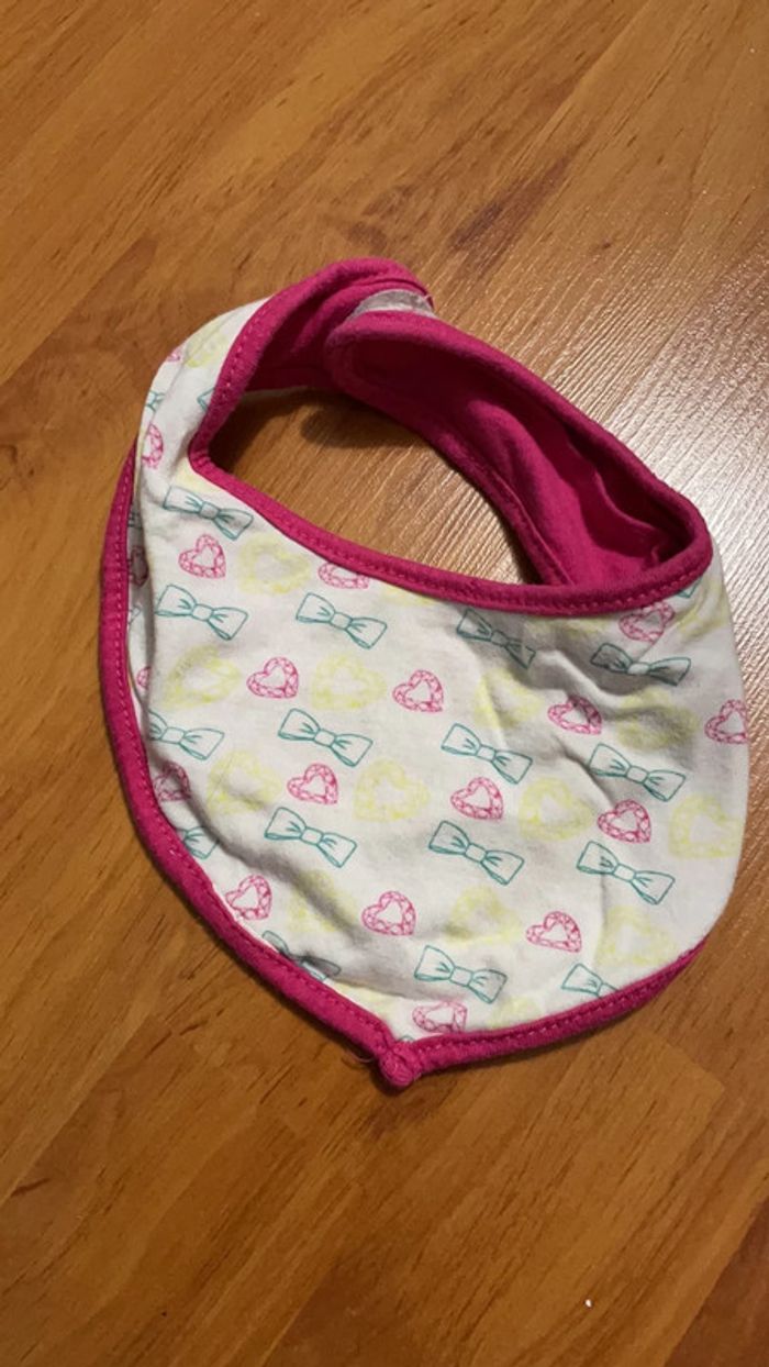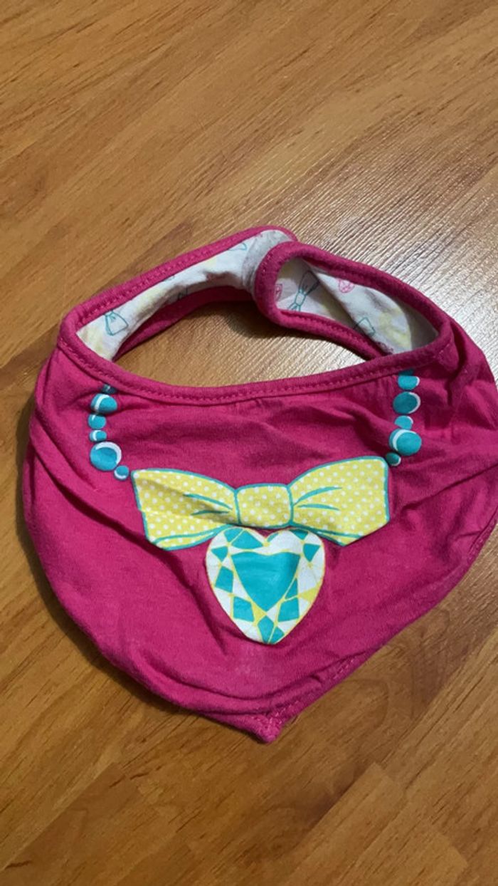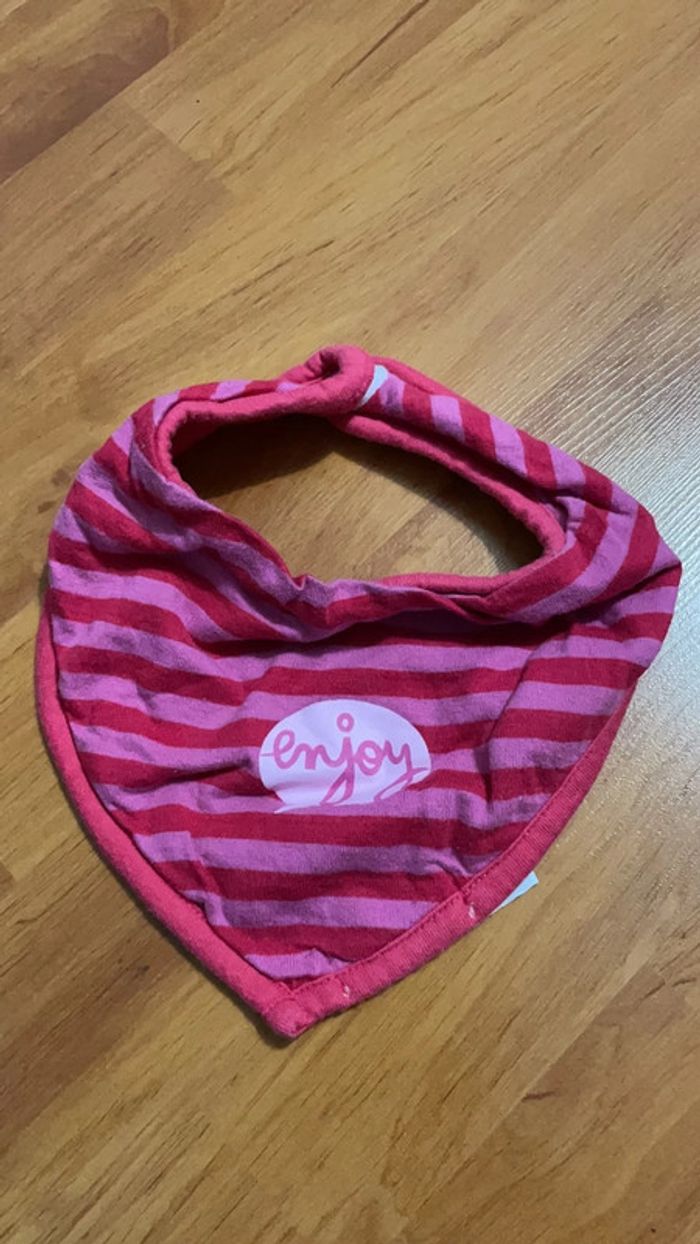 Lot de 2 bavoirs bandana fille à scratch 1 rose à rayures, inscription « Enjoy », l’autre côté est en éponge rose foncé ; l’autre réversible avec motifs neufs et cœurs d’un côté, et imitation collier de l’autre. Très bon état #dressingdeJennifille