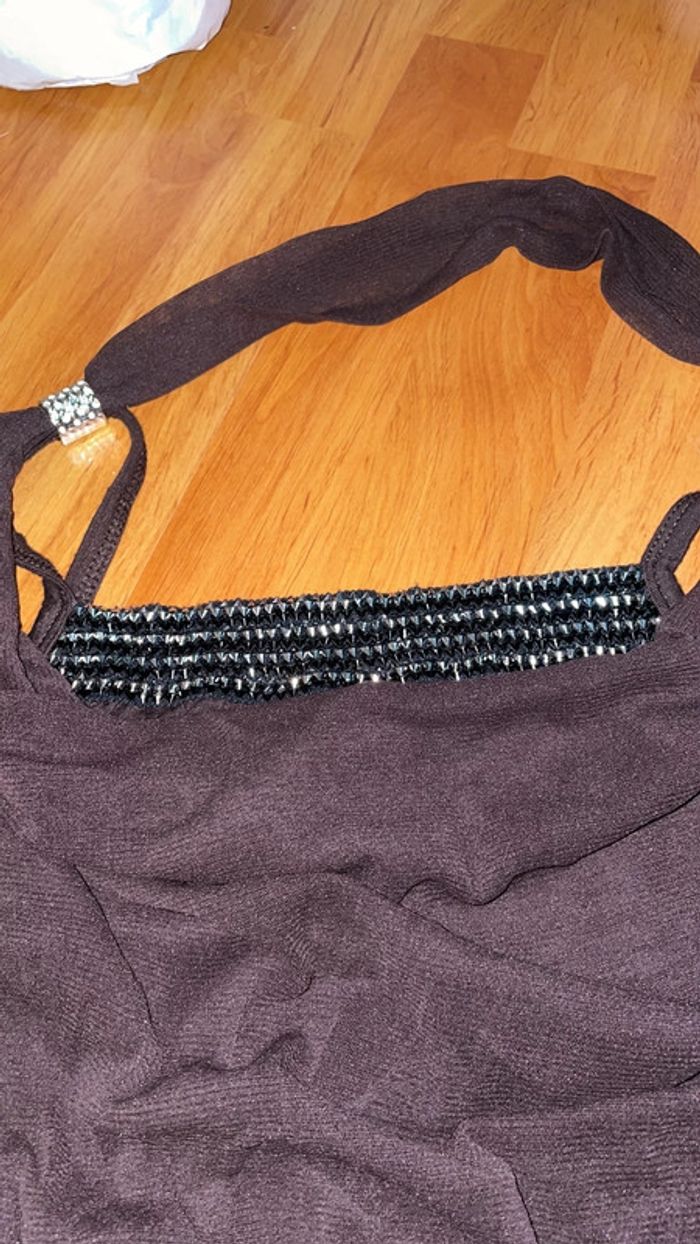 Haut marron à fines bretelles avec brillant sur le devant et voile qui retombe sur le décolleté ainsi que du voile autour du cou. La taille est illisible sur l’étiquette mais doit correspondre à du 36. Très bon état #dressingdeJennivêtementstaille36