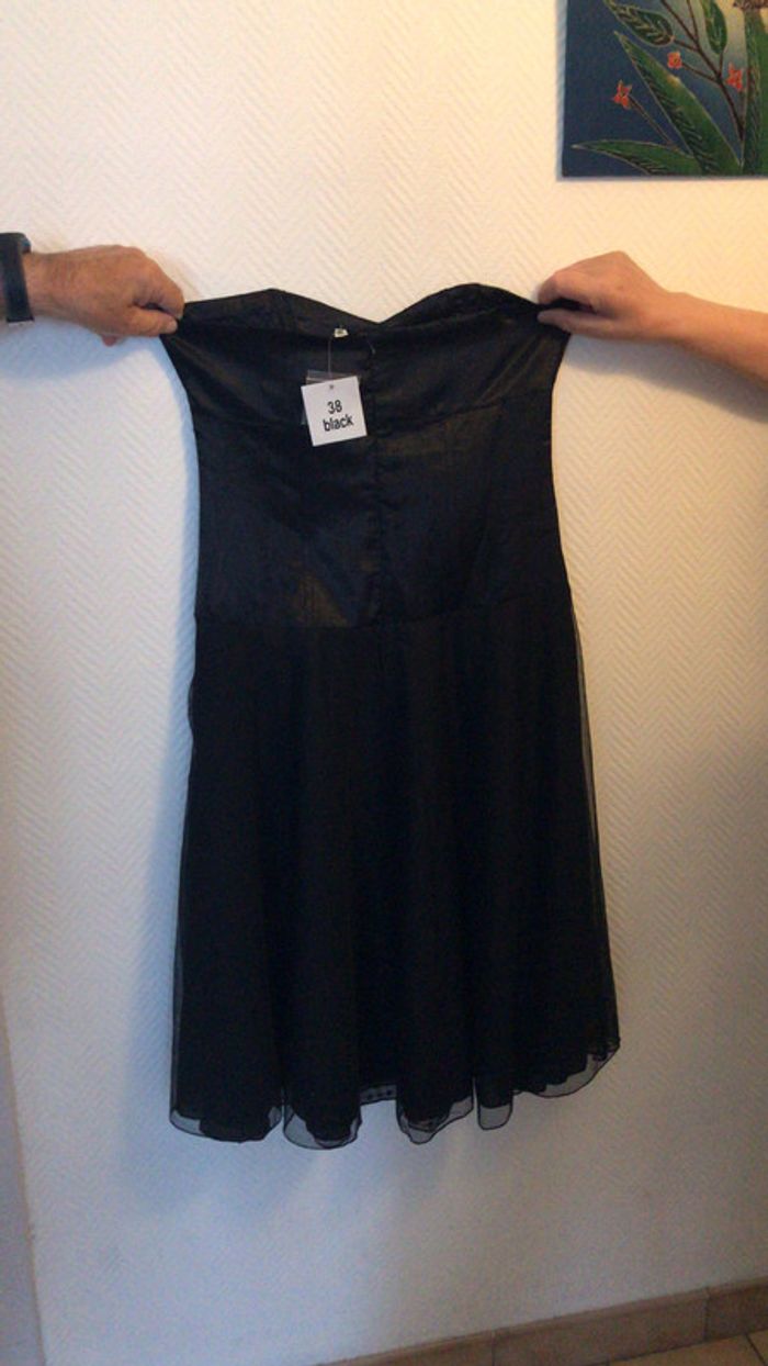 Robe noire bustier doublée d’un voile avec strass. Neuve, encore l’étiquette ainsi que des strass supplémentaires. Taille 38 #dressingdeJennivêtementstaille38
