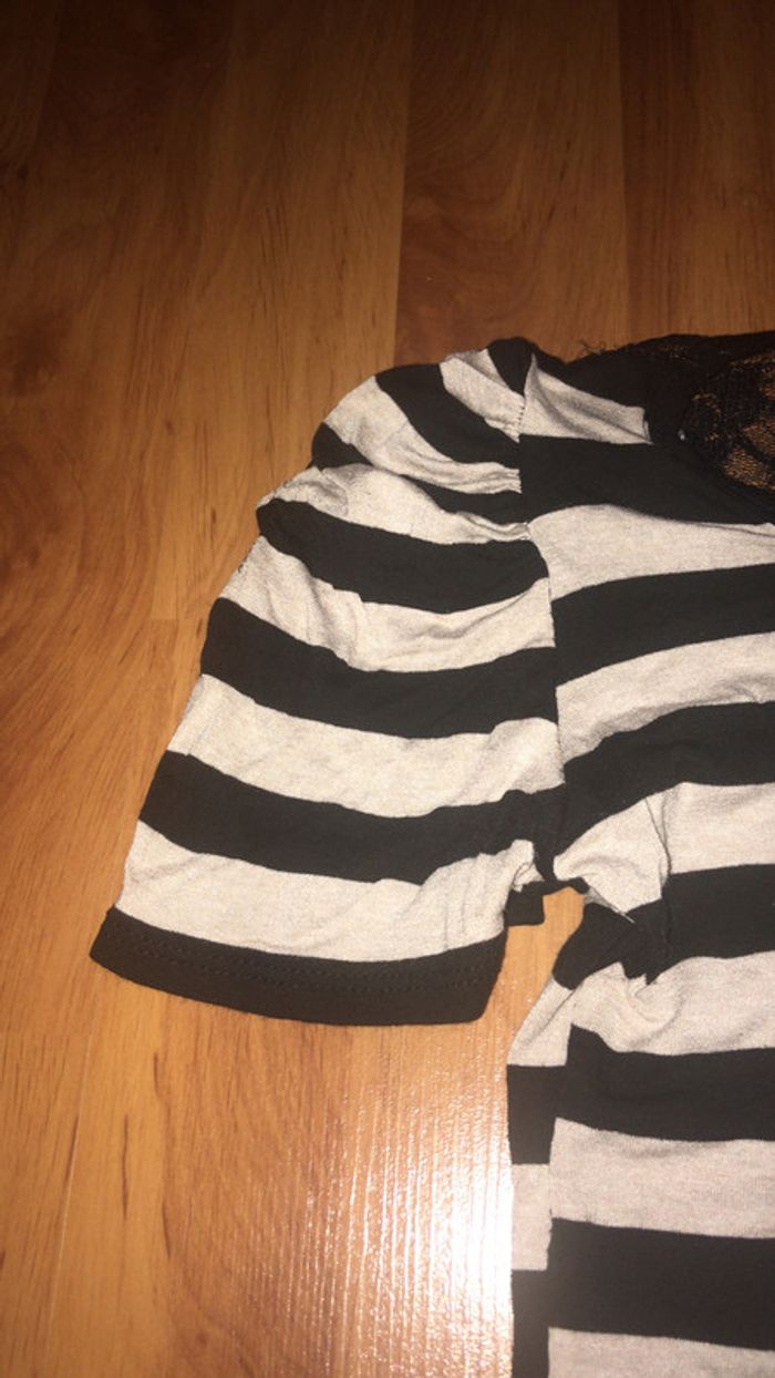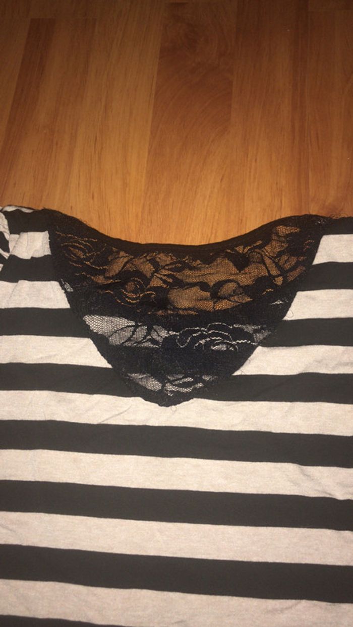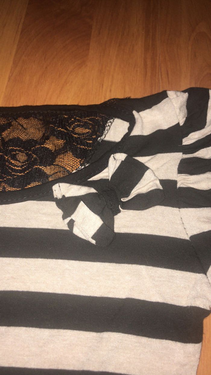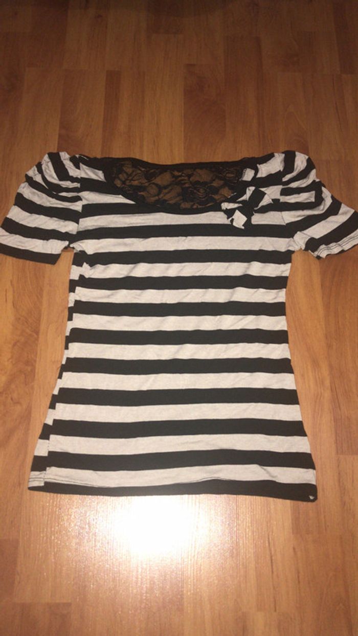 T-shirt moulant rayé noir et beige avec petit noeud sur le devant et dentelle dans le dos. Taille 34/36 Très bon état #dressingdeJennivêtementstaille34 #dressingdeJennivêtementstaille36