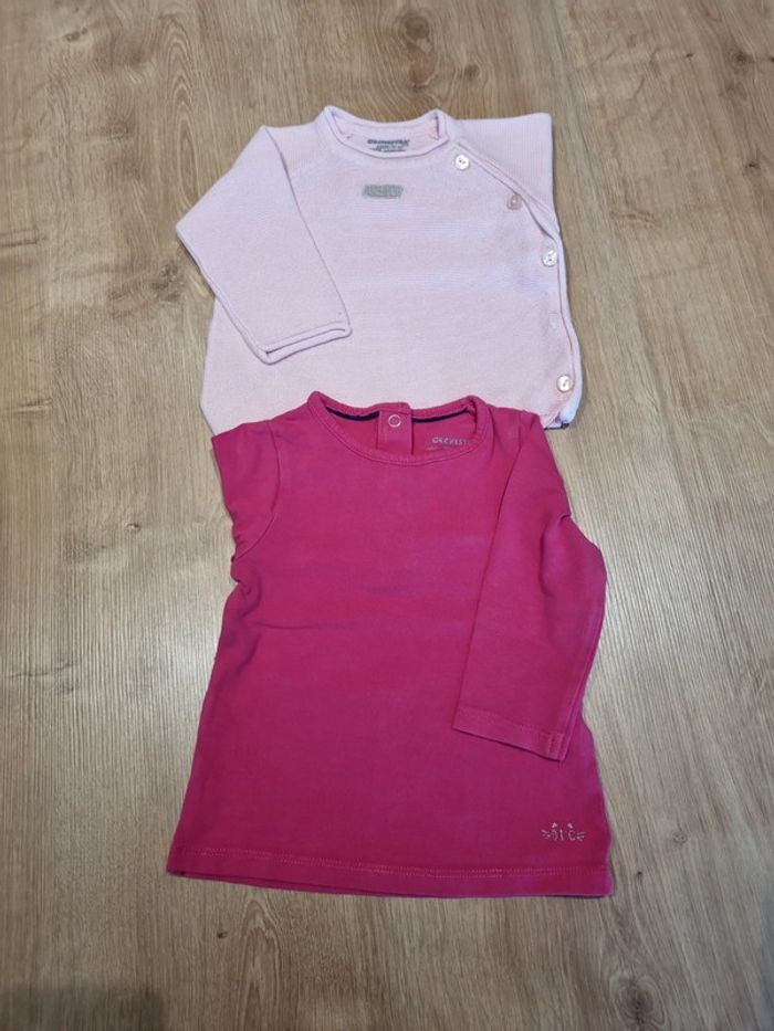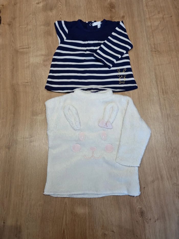 Comprenant 2 hauts manches longues (orchestra et kitchoun) un pull léger en coton (orchestra) et un pull pilou pilou très chaud (boîte à malices) Le tout en excellent état. Taille 6mois