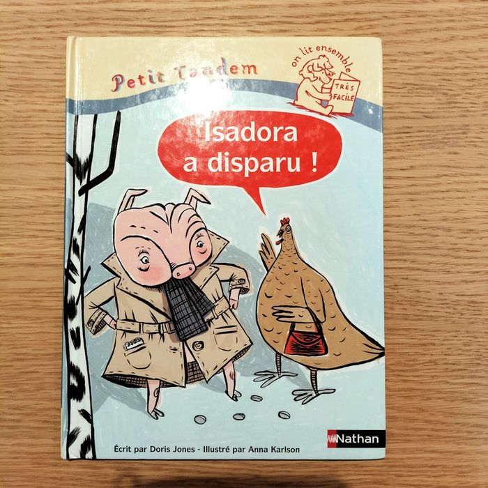 Livre Isadora a disparu. Collection PETIT tandem. Aux éditions Nathan. C'est une collection de livres permettant aux enfants d'apprendre à lire : le lecteur adulte lit l'histoire et l'enfant lit les bulles, afin d'apprendre à lire tranquillement. Très ludique et très efficace.
