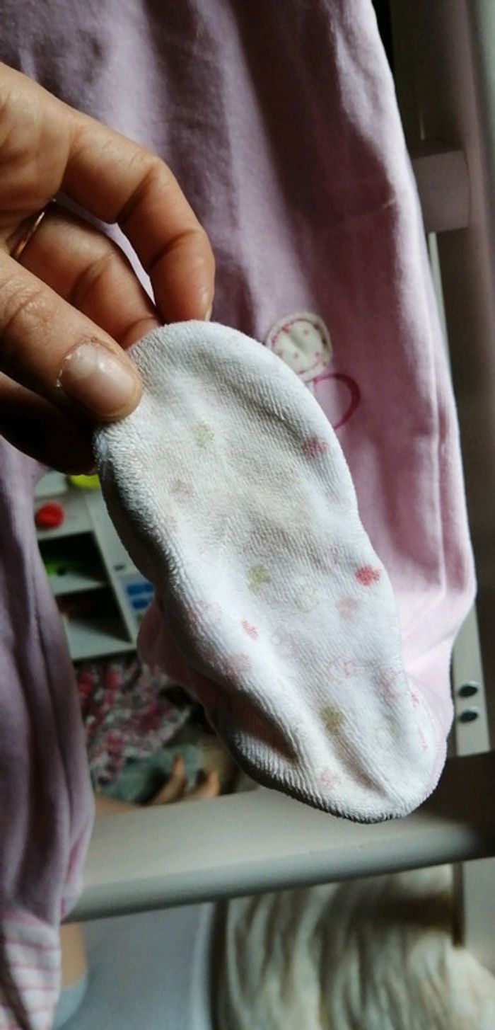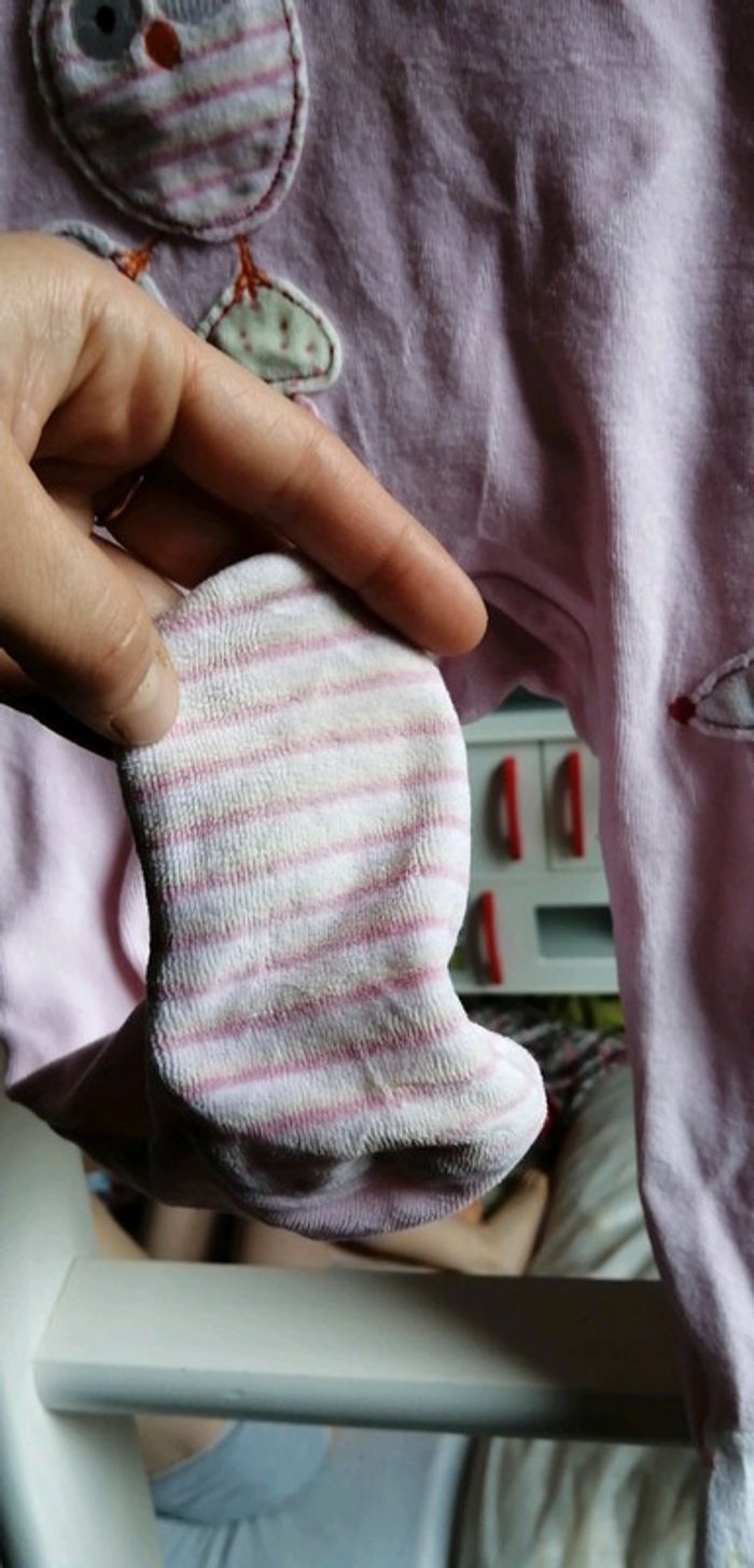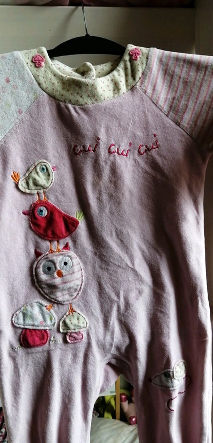 Pyjama petite fille avec plein d'oiseau les manche et pieds sont de couleur différentes très jolie un pied un peu user taille 24 mois