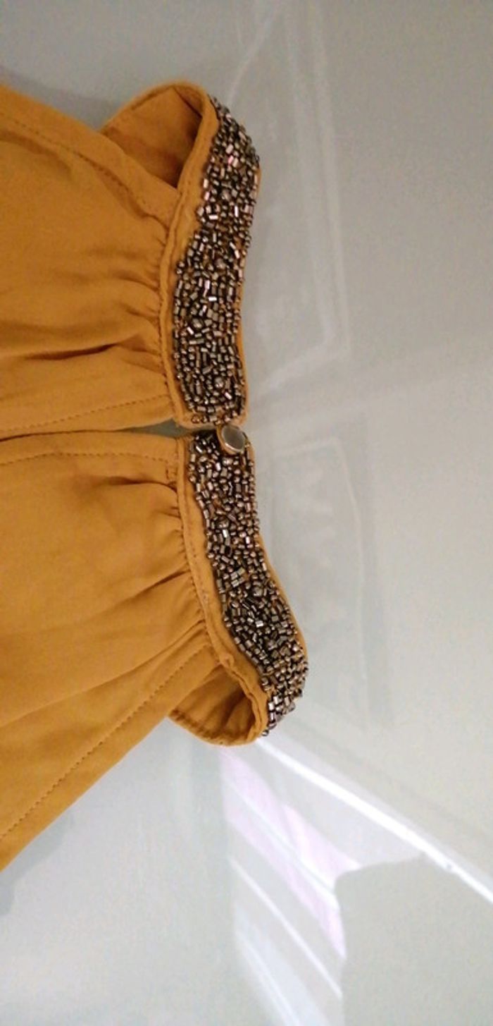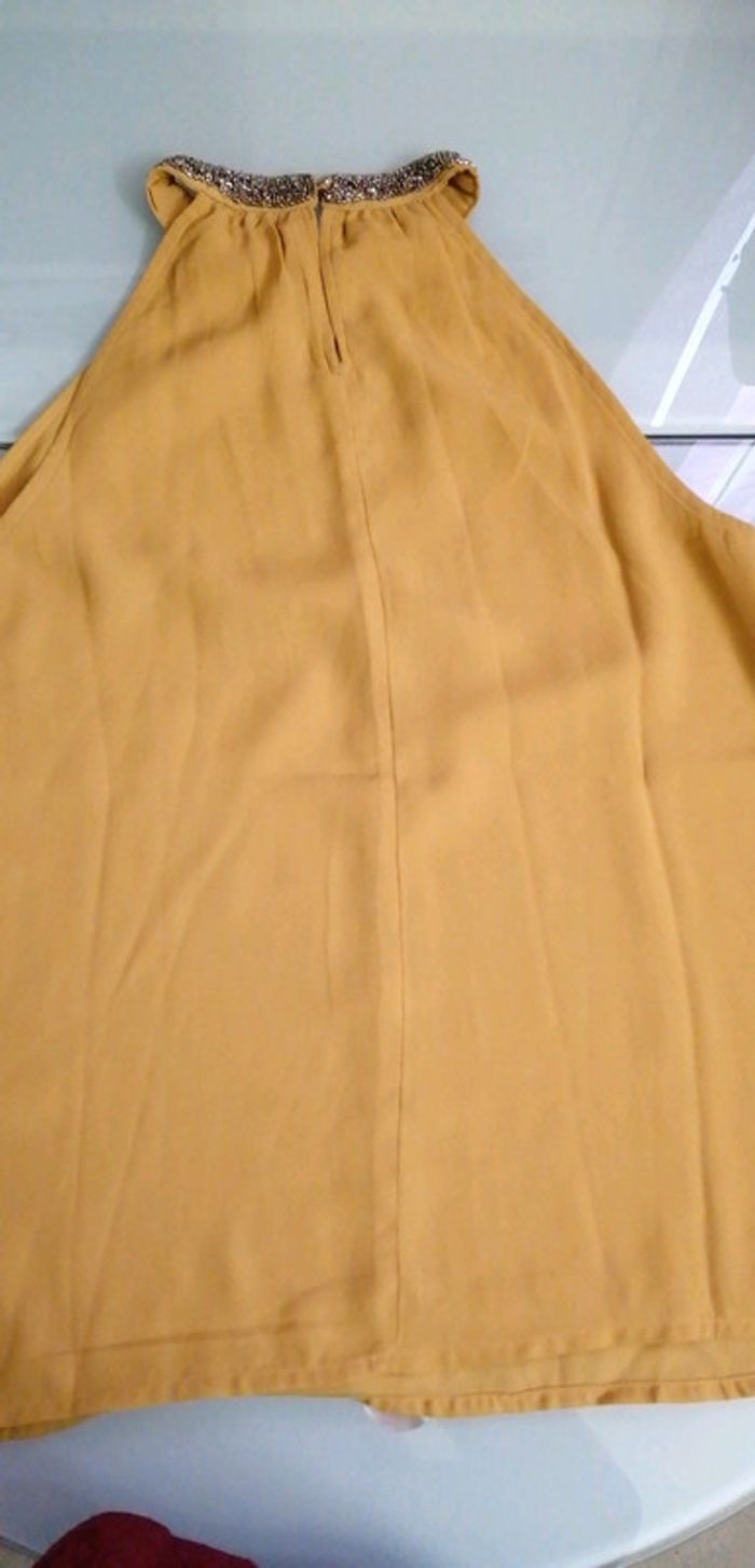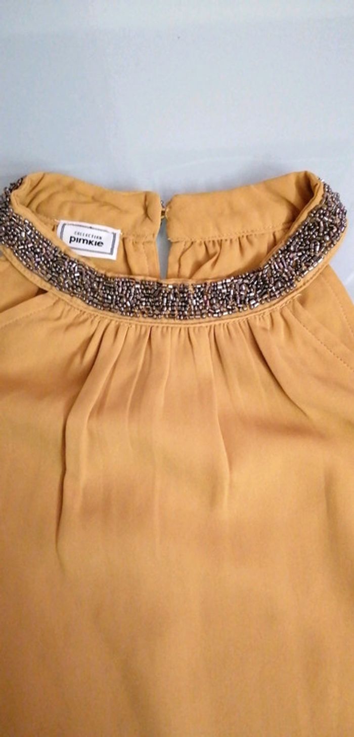 Débardeur femme attache au cou avec des perles très léger couleur camel
