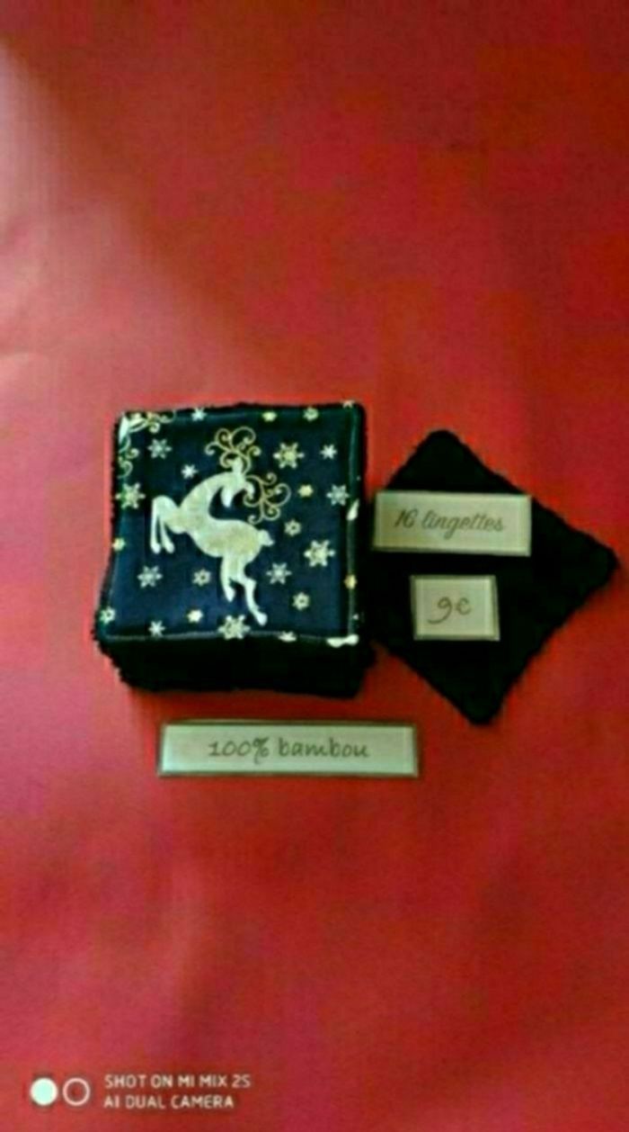 Tissu eko-tex français et éponge bambou noir 10 X10 cm pour bébé et démaquillante pour les mamans 😄.