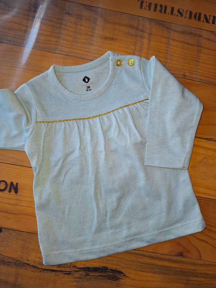 FILLE 3 MOIS N°700 maillot vert d eau / doré Bouton épaule 64% polyester 36 % coton Taille 3 mois Grain de blé 2€ #kelly_fille3mois