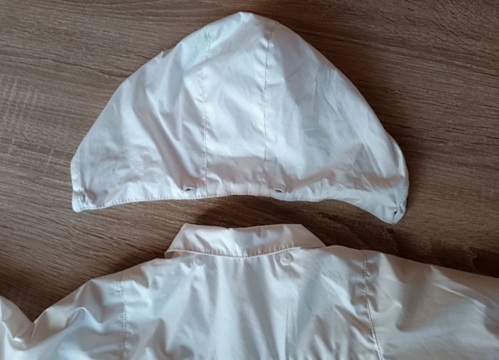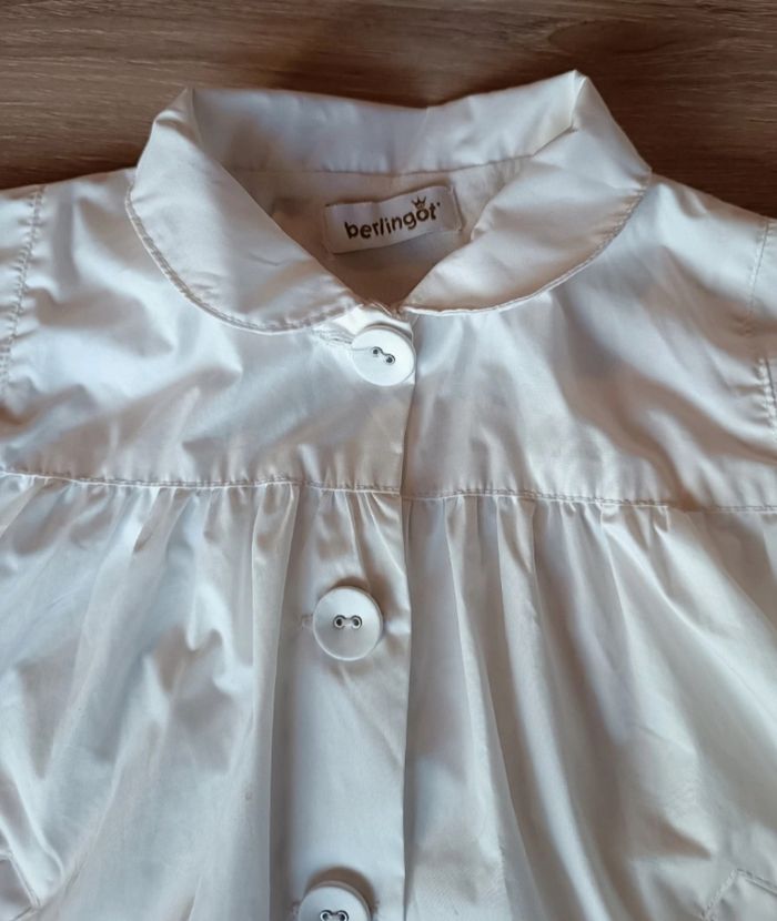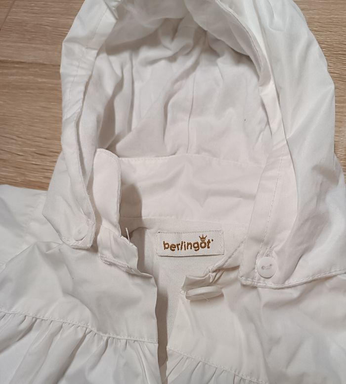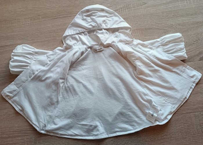 Veste blanche à capuche détachable. Marque Berlingot. Taille 12 mois Peu portée. Fermeture 4 boutons. 2 poches Intérieur 100% coton. Extérieur 100% polyamide.