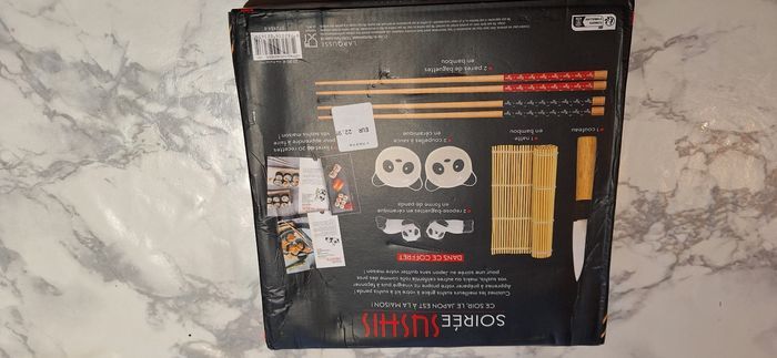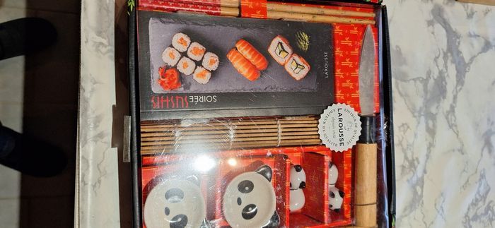 Vends un coffret neuf pour la realisation de shushi. Set pour 2 personnes comprenant baguettes, repose baguette, bol à sauce, natte bambou, couteau et 1 livre de recettes Ideal cadeau de Noël a petit prix
