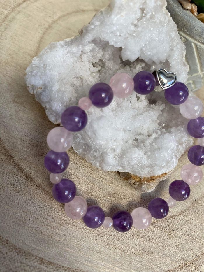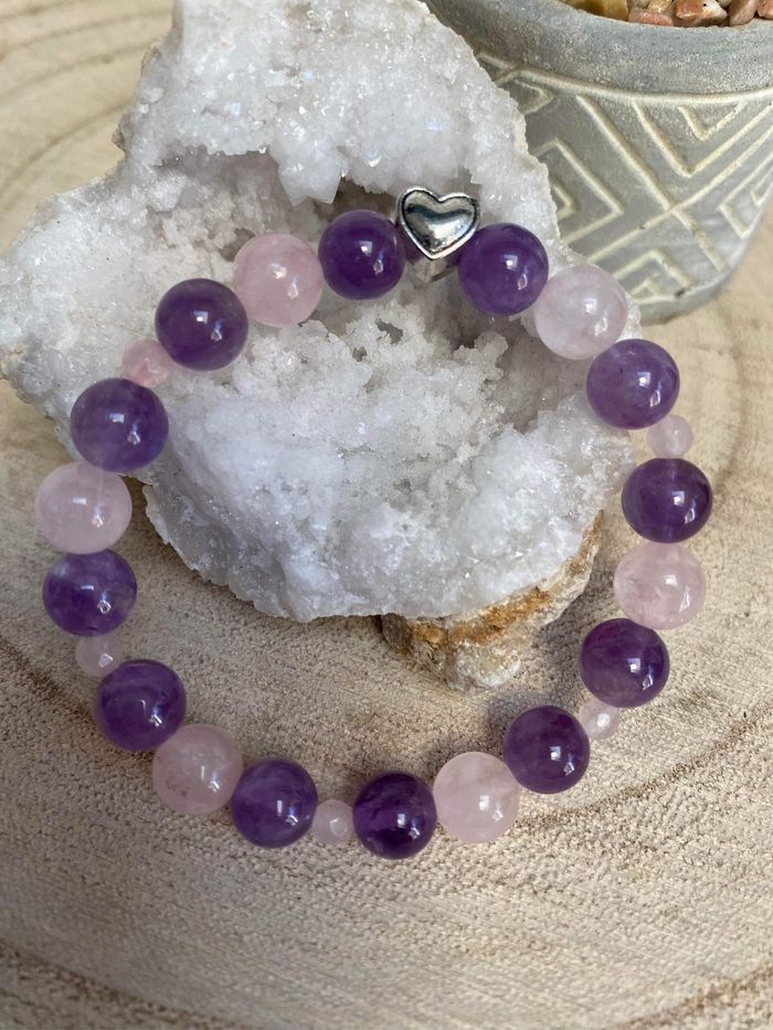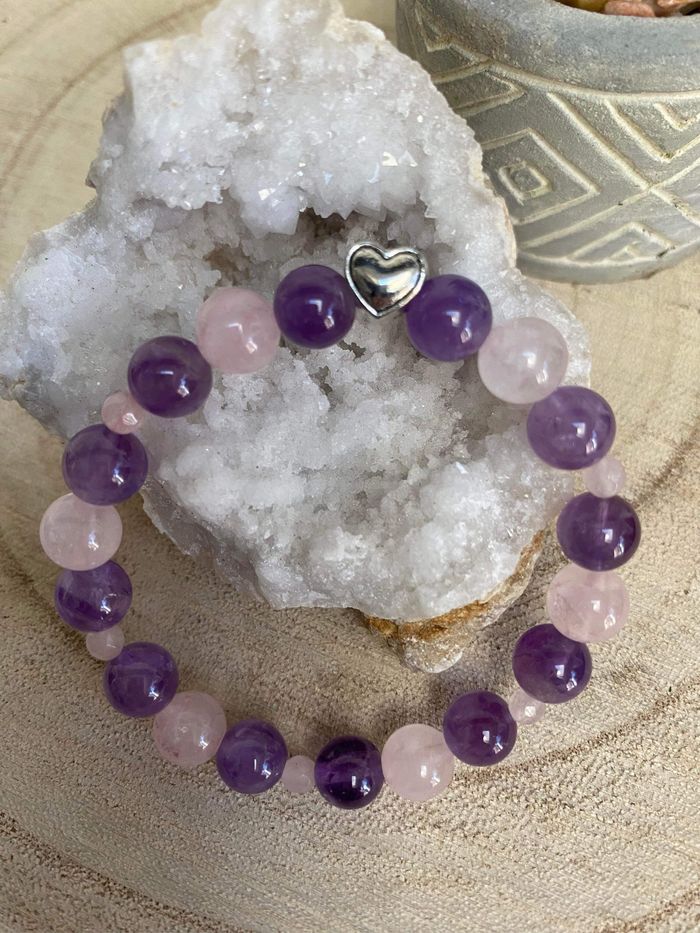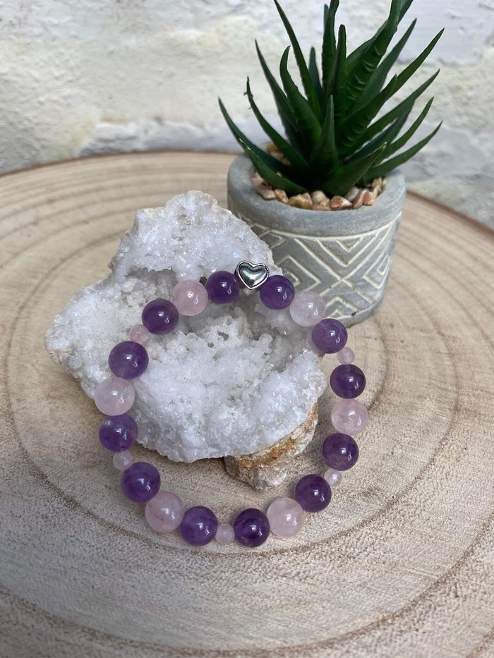 Bracelet en améthyste , quartz rose et cœur , lithothérapie