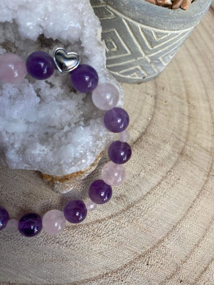 Bracelet en améthyste , quartz rose et cœur , lithothérapie - photo numéro 1