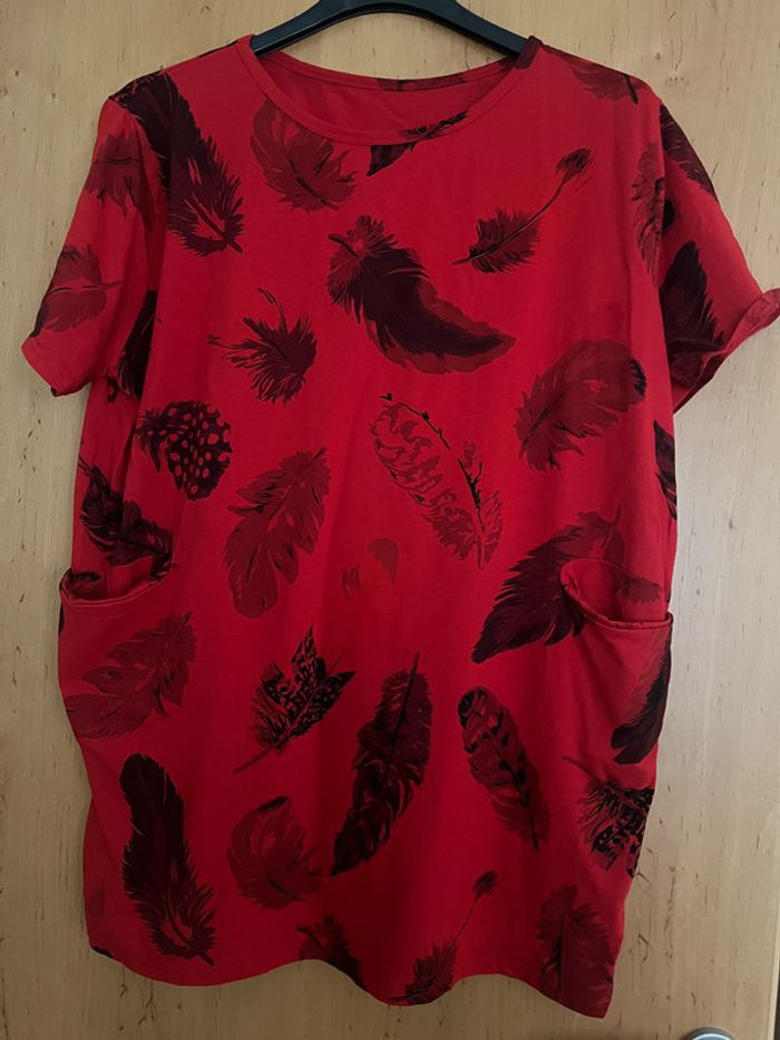 Très jolie tunique longue overzise TU, Il a 2 poches sur le devant, il est assez long pour cacher les fesses Peux convenir d'un 38/40 jusqu'au 44/46 Porté 1 seule fois #tshirtlong #tunique #rouge #noir #plume #sonia57690