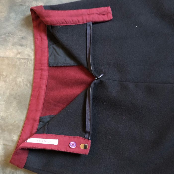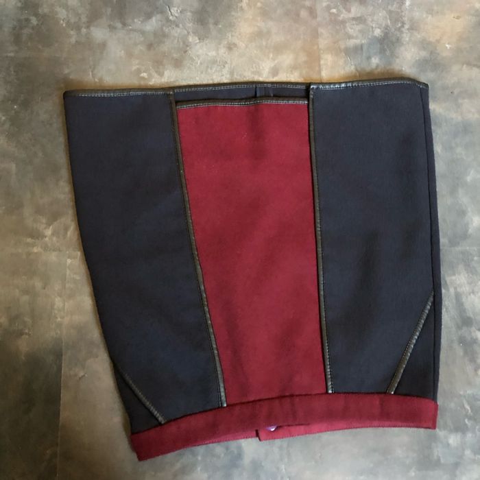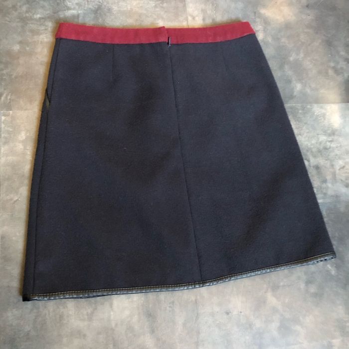 Magnifique jupe D’hiver bi matières en parfait état Beau lainage bleu marine et bordeaux bordé d’un similicuir noir Asymétrie en bas devant 2 poches Taille 34 La ceinture mesure à plat 35 cm Longueur 44 cm Marque Camaïeu