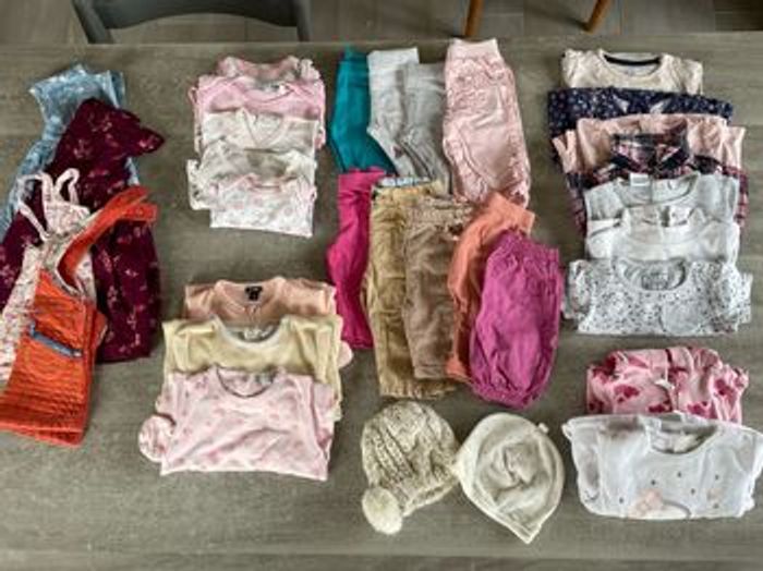 Vend lot de vêtements pour fille, taille 3 mois (32 pièces), mi-saison - toute marque - très bon état général 3 PYJAMAS dont 1 pyjama avec fermeture eclair sur le devant, marque kiabi 5 BODYS Dont 2 body avec système de pression sur le devant Sur 1 body , présence d une petite tâche 7 TEE SHIRT : - 1 tee-shirt manche courte - 5 tee-shirt manche longue - 1 chemise manche longue 8 PANTALONS - 2 pantalons en toile légère - 1 pantalon epais, marque grain de blé - 5 leggings 1 SHORT toile légère 4 ROBES 2 PULLS Dont 1 sweat a capuche 2 BONNETS