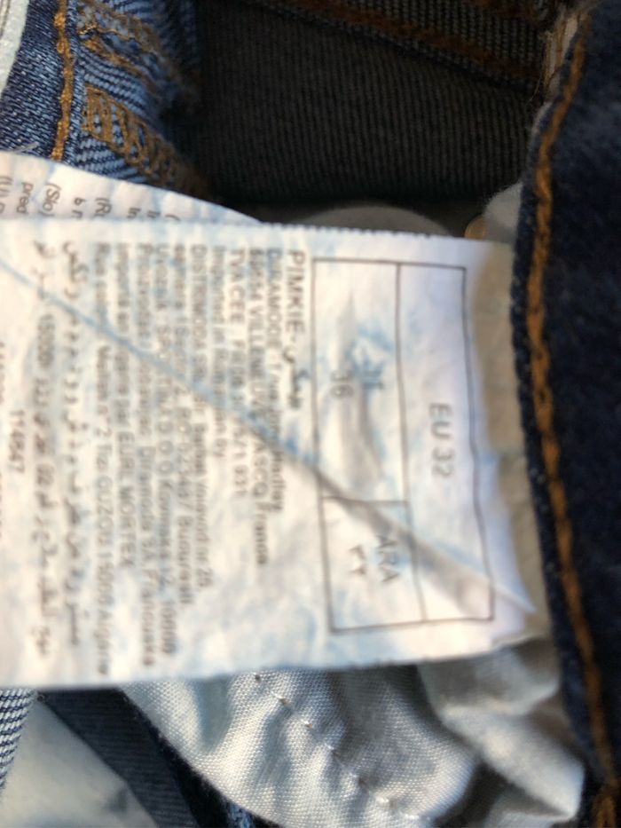 Jeans bleu bien strech taille haute Taille 32 La ceinture mesure à plat sans tirer 30 cm, va jusqu’à 35 cm en tirant. Hauteur niveau braguette 26 cm Longueur entre jambe 63,8 cm Largeur à plat bas des jambes 17,4 cm 94% coton 4% polyester 2% élasthanne Pimkie