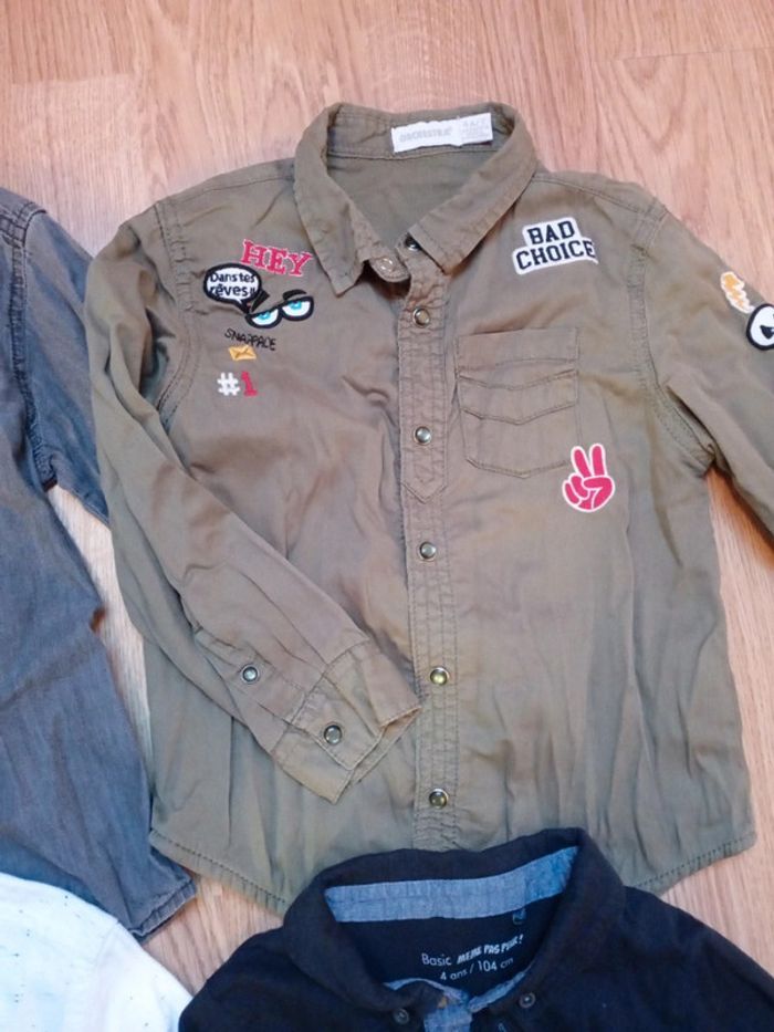 1 chemise noire en "jean délavé" fine (même pas peur) 1 chemise kaki avec écussons, doublée (orchestra 1 chemise col mao, blanche tachetée (orchestra) 1 polo manches longues noir/effet jean sur poche et col, MANQUE UN BOUTON (même pas peur) lot dissociable d'autres articles en 4 ans #kaylaenk_boys_4ans