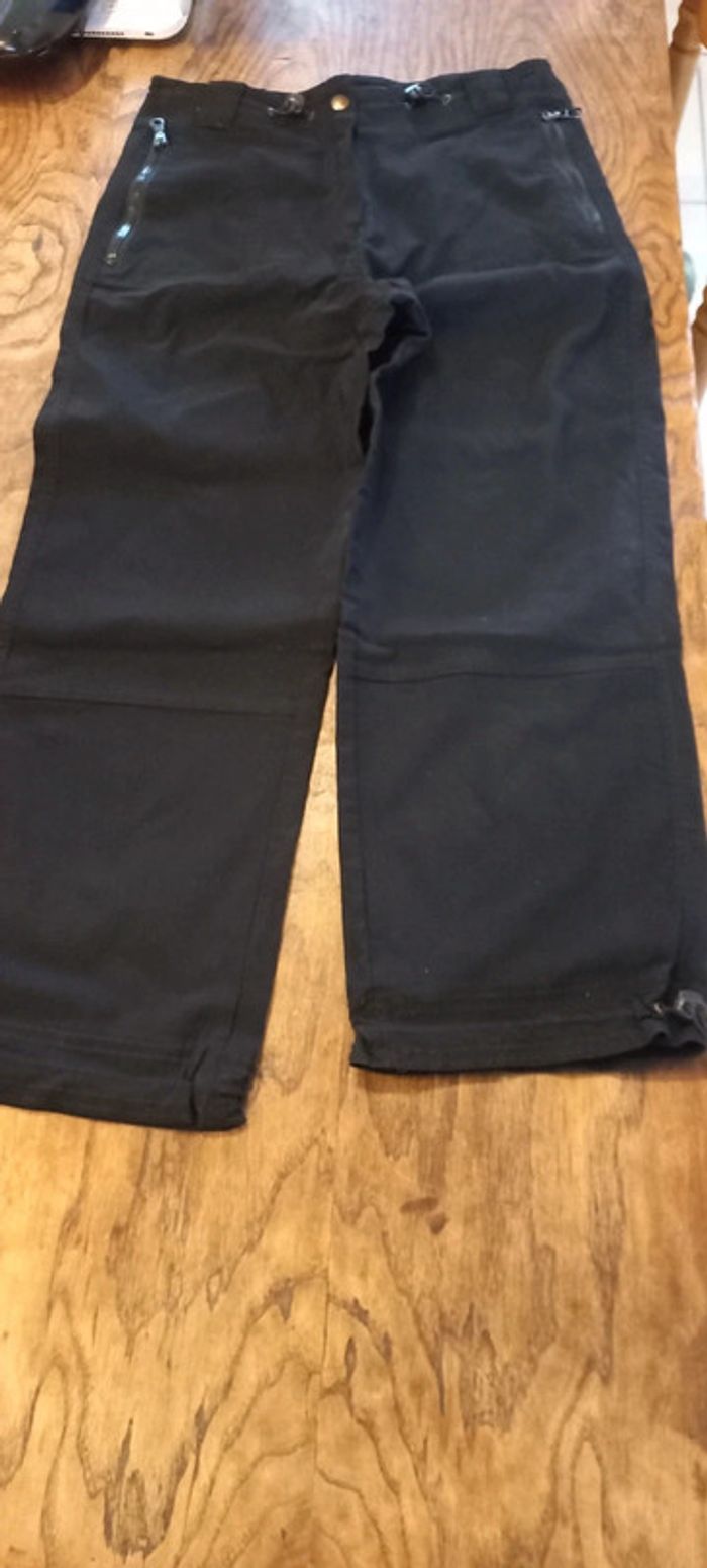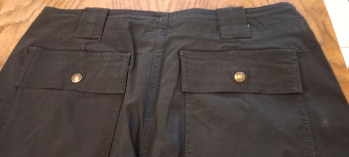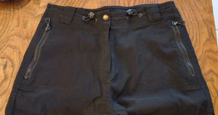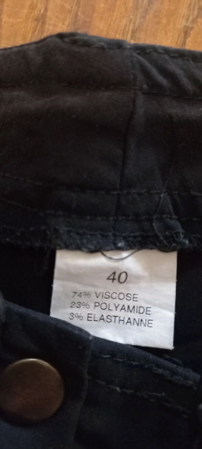 Pantalon noir femme Taille 40 Longueur totale 85 centimetres Largeur bas 19 centimetres Fermées par zip et bouton 2 poches fermées par zip 2 poches arrière fermées par boutons Liens de serrage à la taille et en bas des jambes
