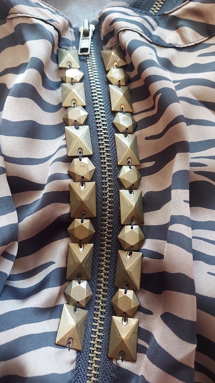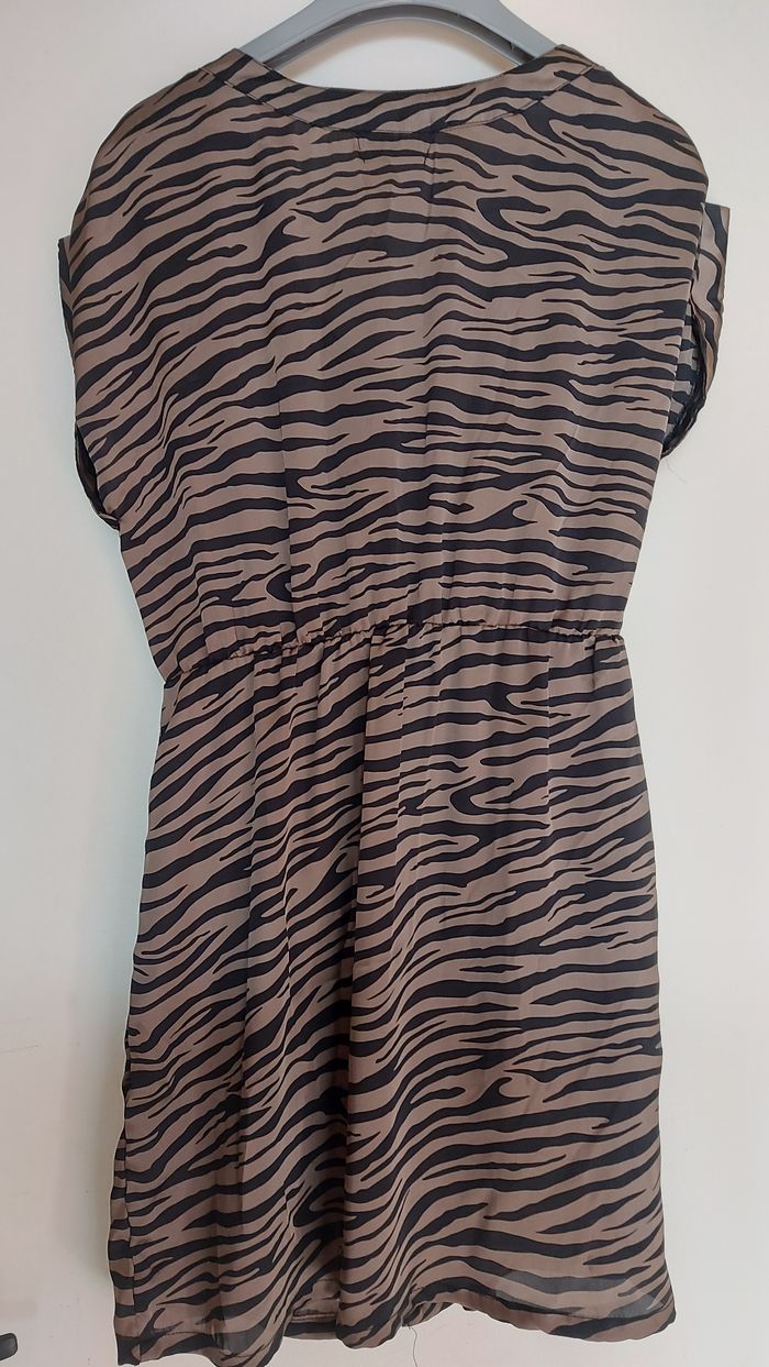 Robe satinée zébrée taupe et noir. 100% polyester.