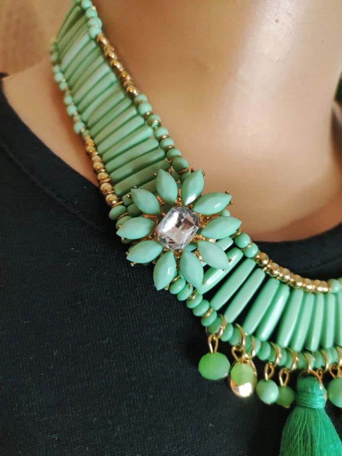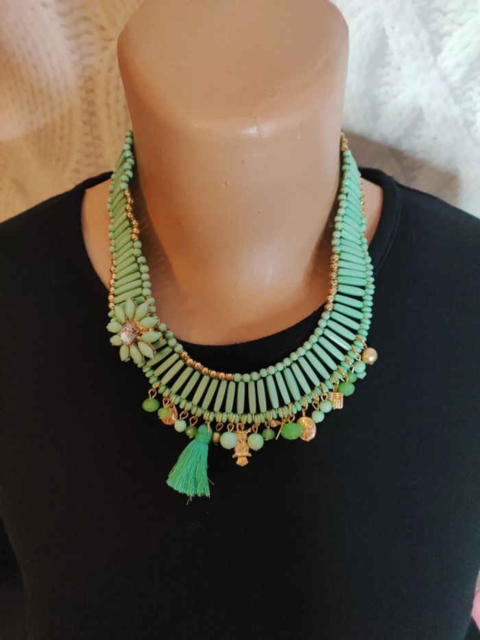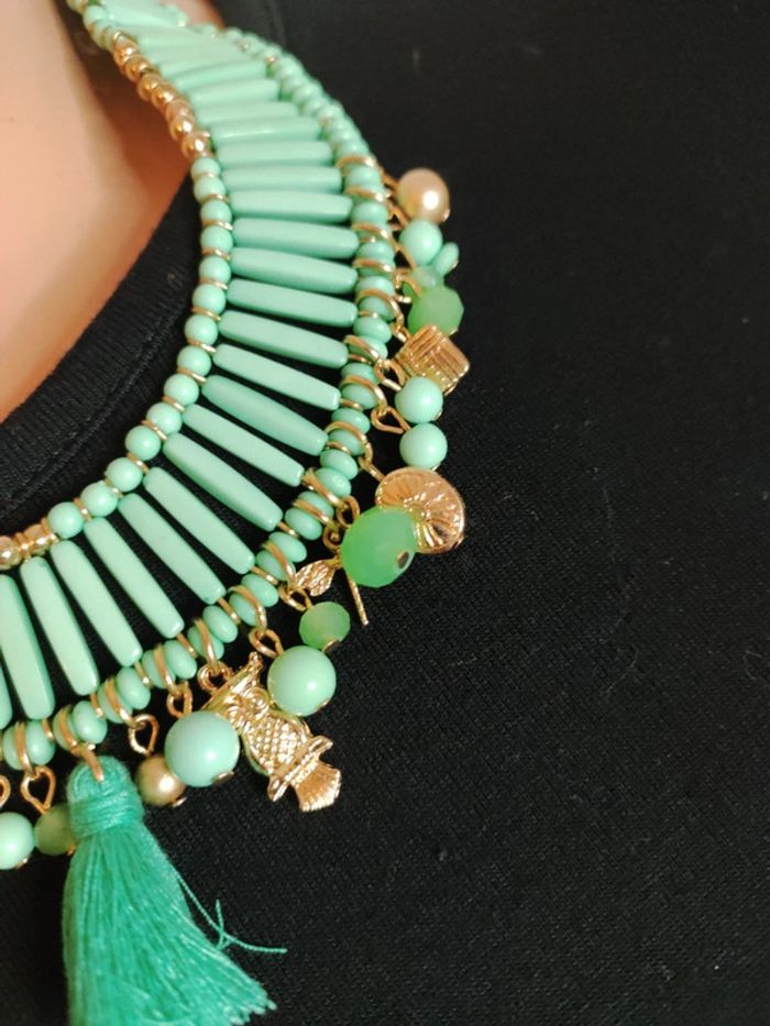 Très bon état collier vert avec plein de breloque pompon chouette fleur matière plastique et métal doré #baronnecollier