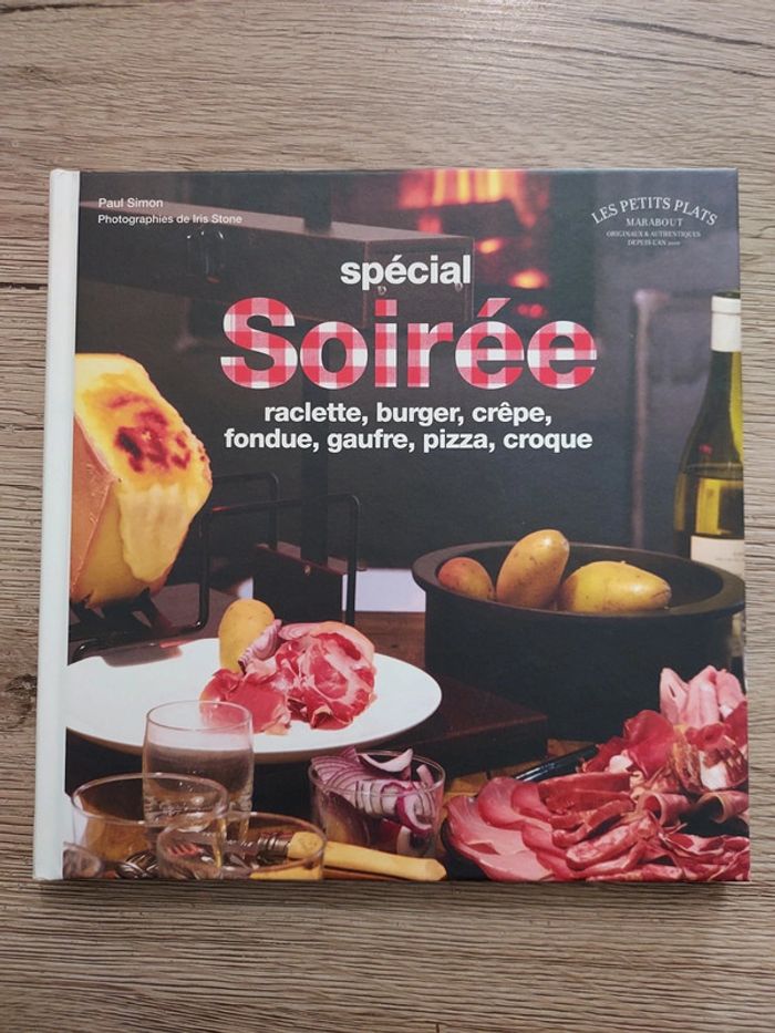 Livre de recettes "Spécial soirée" : raclette, burger, crêpe, fondue, gaufre, pizza, croque Livre quasi neuf Valeur : 7.99€
