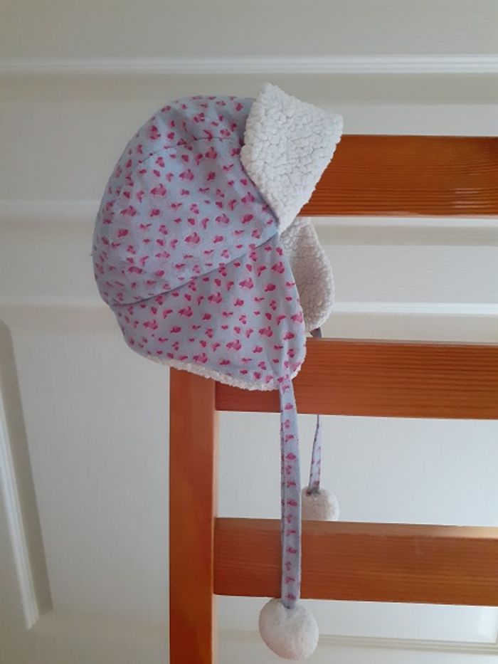 Bonnet doublé avec cache-oreilles. Taille : 44 cm (6-9 mois). Excellent état