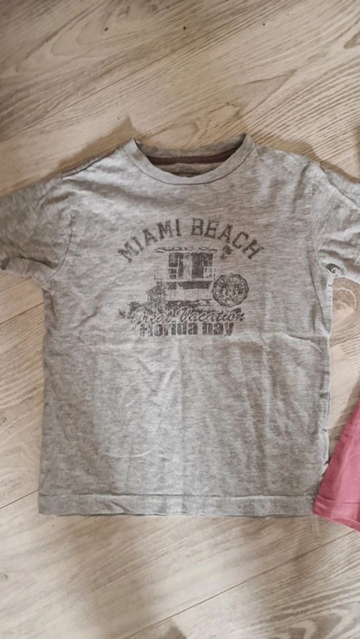 Lot de deux tee shirts manches courtes dont un gris clair avec imprimé gris foncé Miami Beach. De chez Verbaudet. Et d'un tee shirt couleur vieux rose / bordeaux clair simple mais classe de chez Tape à l'œil. Parfait pour printemps été et vacances au soleil. Taille 5 ans. #garcon5ans #tao #tapealoeil #verbaudet #dressingdetaig5ans