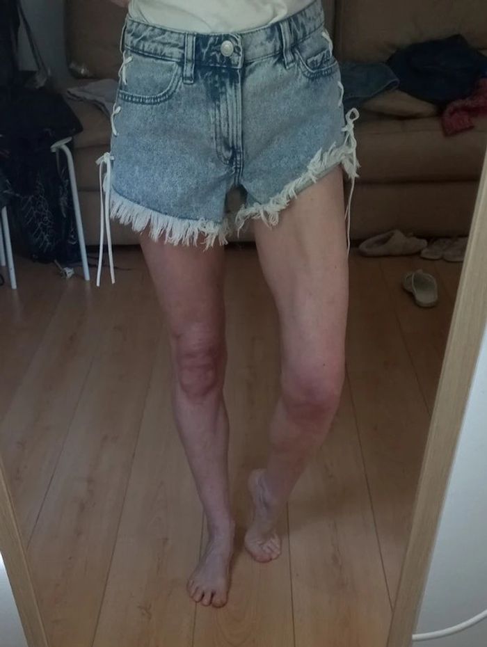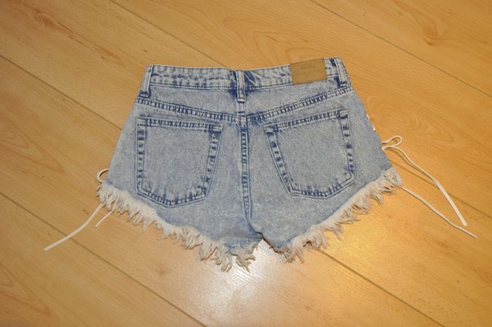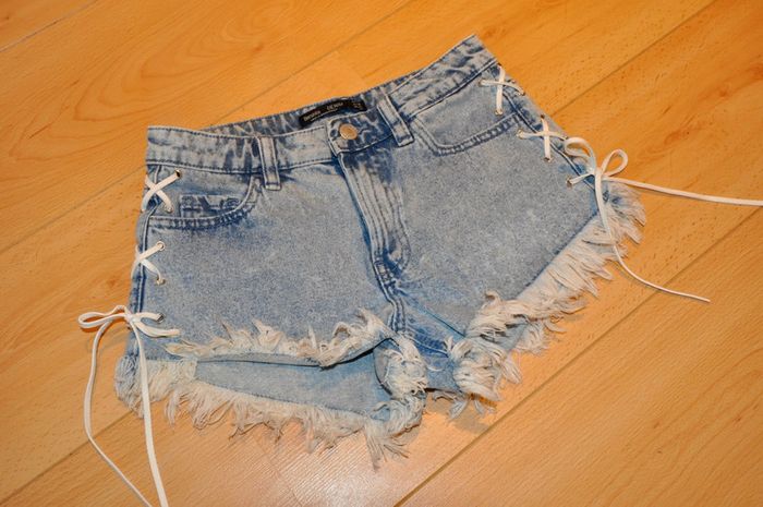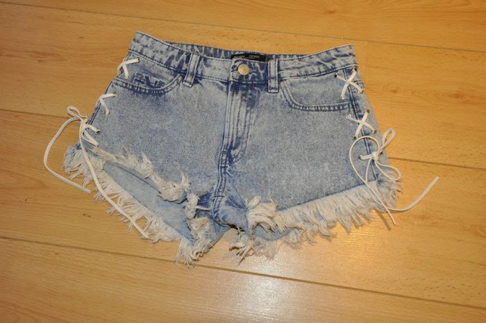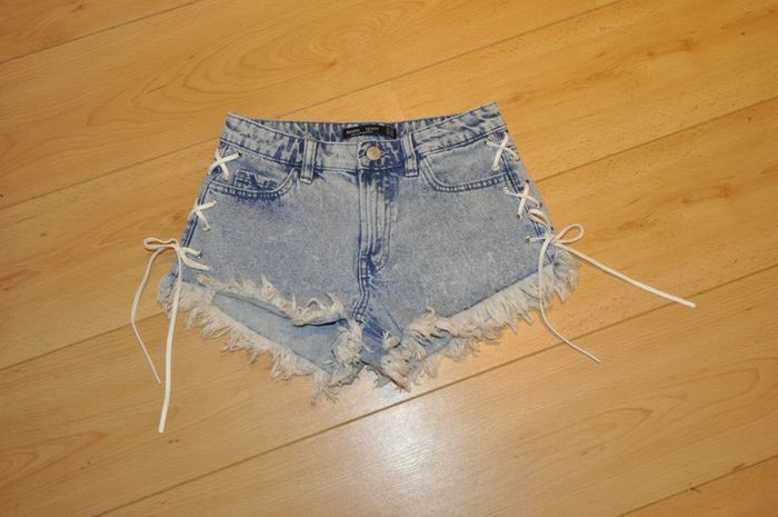 short en jeans taille basse avec bas effiloché, laçage décoratif sur les côtés, jamais porté je les préfère plus longs, largeur taille posé à plat 36 cm, longueur 22cm #ophhaeXS #ophhae34