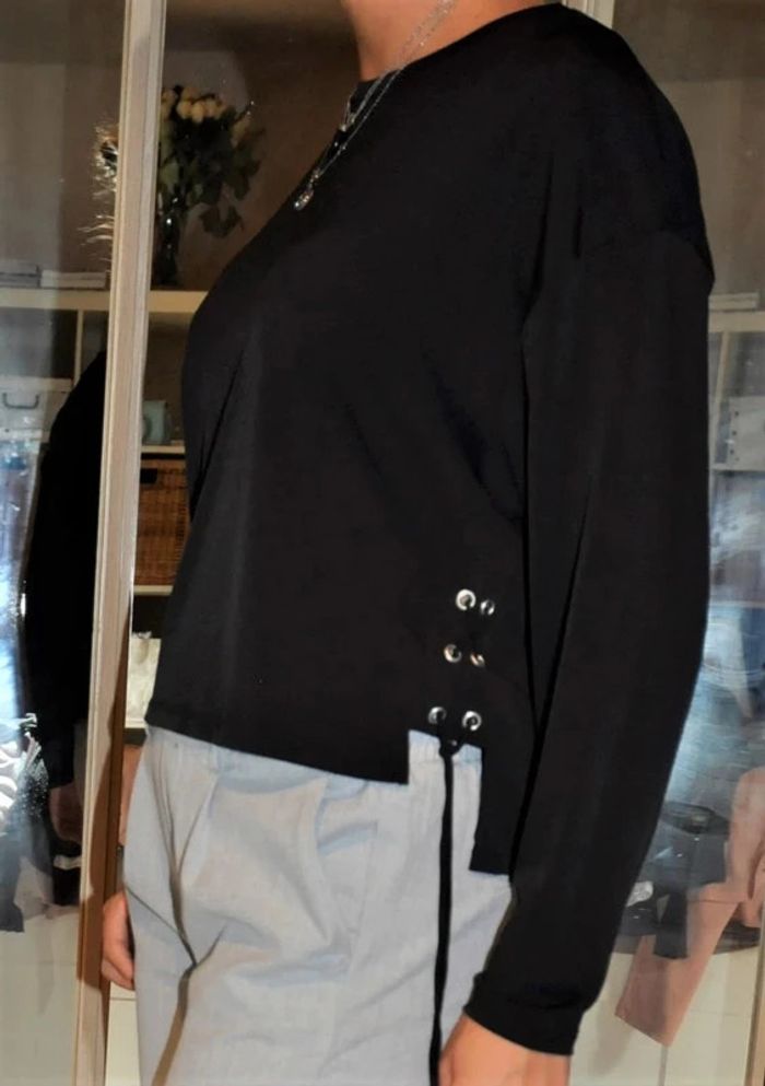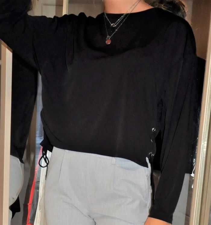 col rond, manches longues, matière fluide légèrement satinée polyester avec élasthane, anneaux avec laçage dans le bas des côtés #ophhaeM