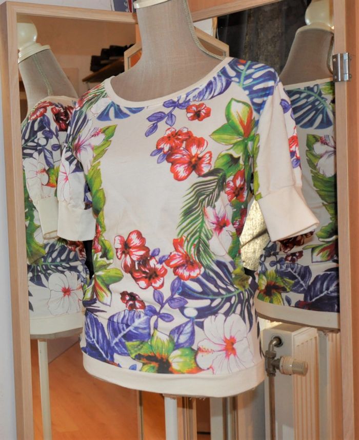 superbe sweat shirt fleuri avec décolleté arrondi et manches au dessus du coude, 97% coton et 3% élasthane #ophhaeS