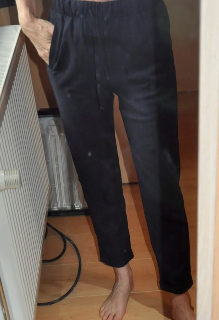 modèle à enfiler avec taille élastiquée et cordon, poches en biais, petit rebord dans le bas, tissu hiver mélange polyester bleu marine avec très fines lignes bordeaux #ophhaeXS #ophhae34