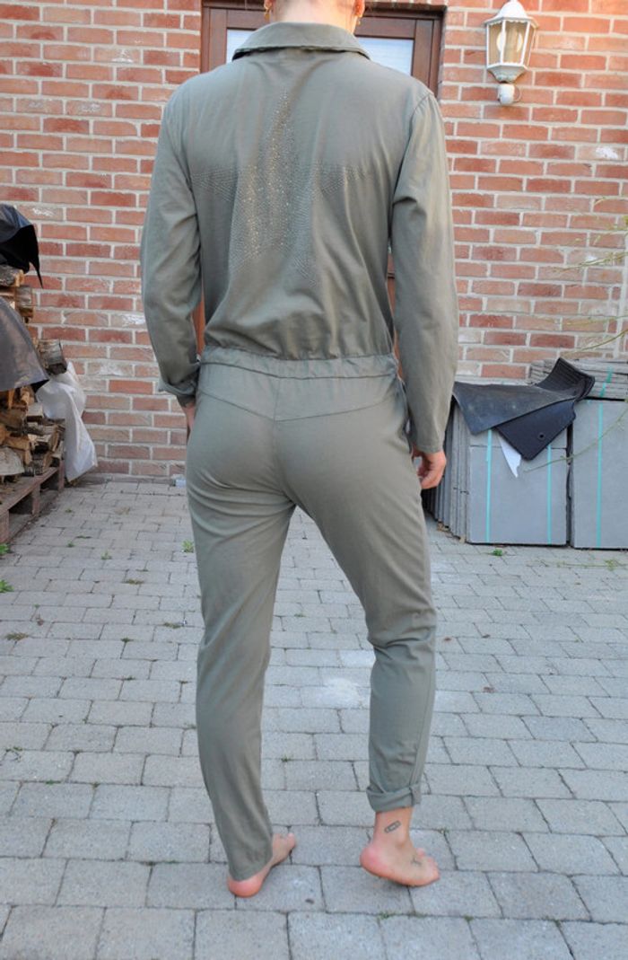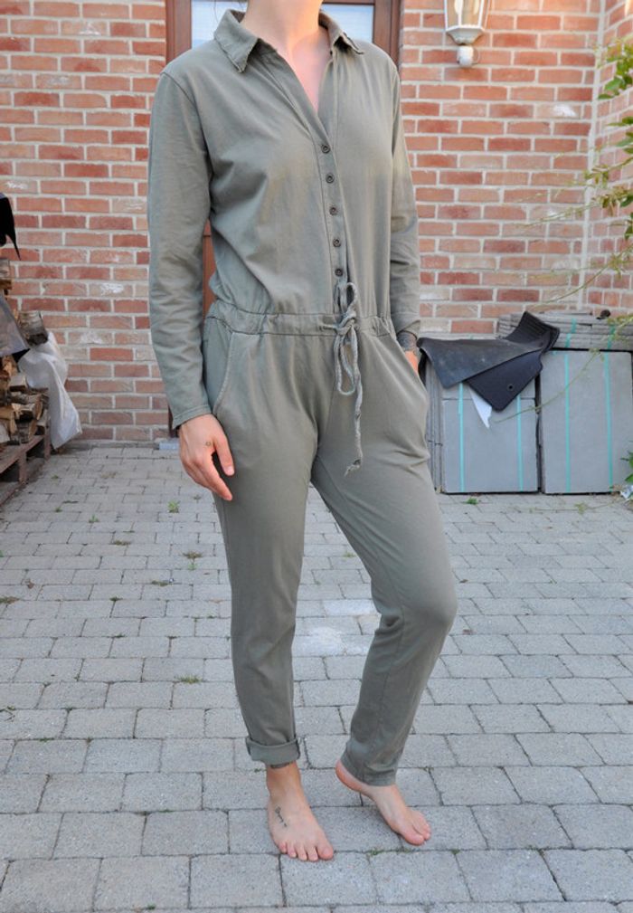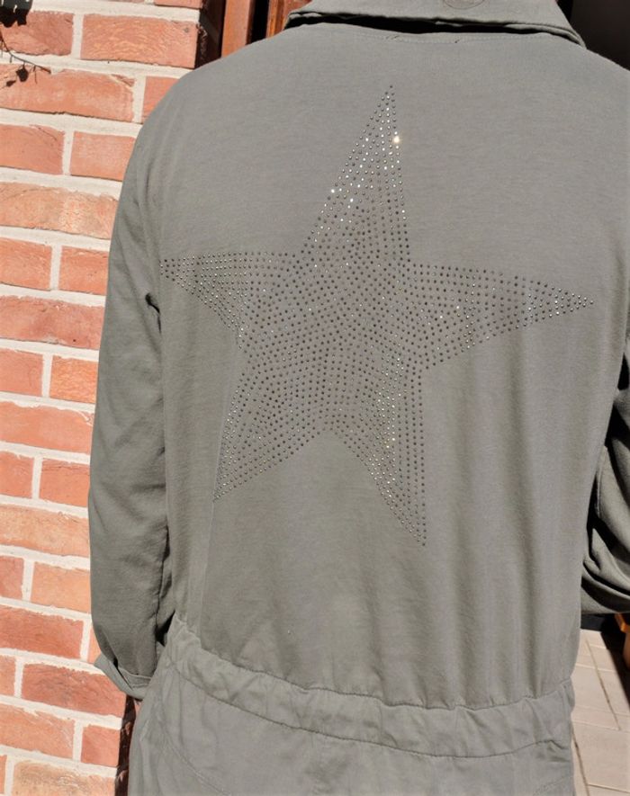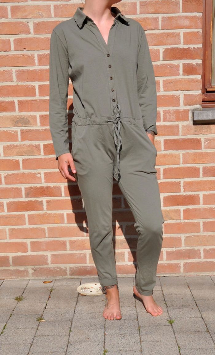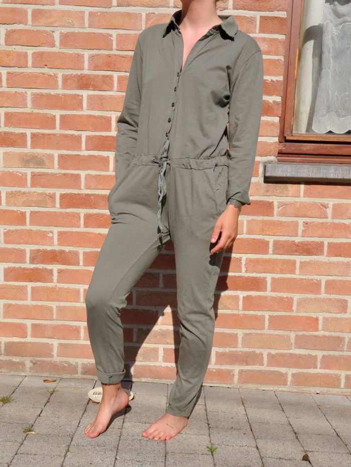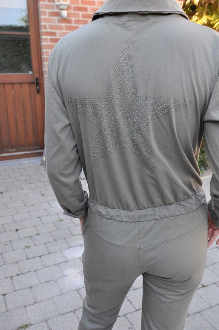 très belle combinaison pantalon en coton fluide kaki, motif étoile finement pointillé dans le dos, poches en biais, cordon de serrage à la taille, made in Italy et 100% coton