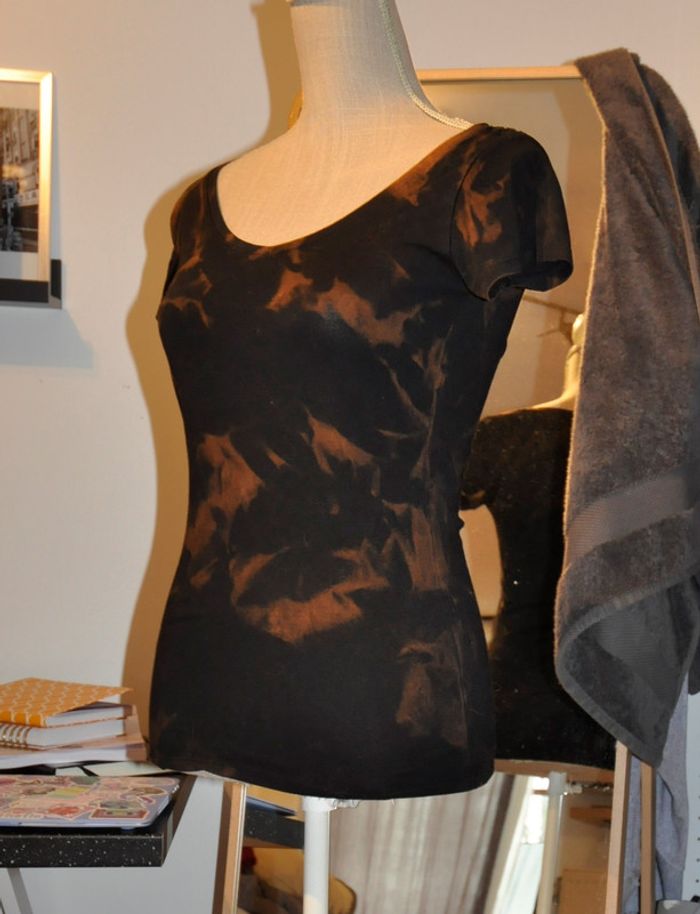 modèle manches courtes avec grand décolleté en v, tye&dye noir et brun orangé, stretch avec élasthane #ophhaeXS