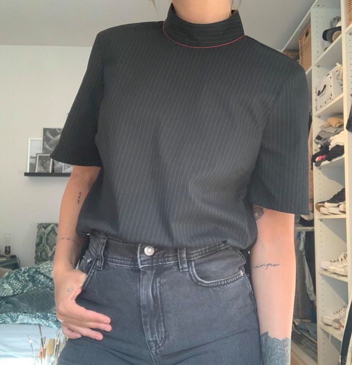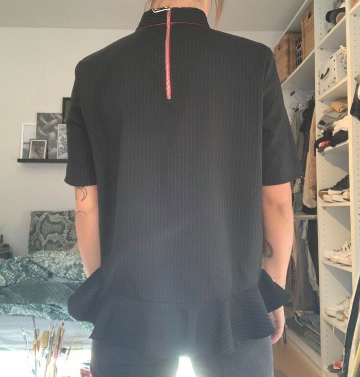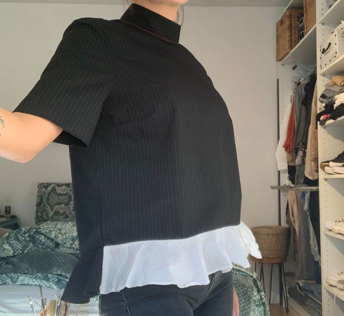 blouse en polyester avec petit col montant fermé par tirette détail rouge dans le dos, volant dans le bas ton sur ton à l arrière mais en coton blanc à l avant, très originale #ophhaeM