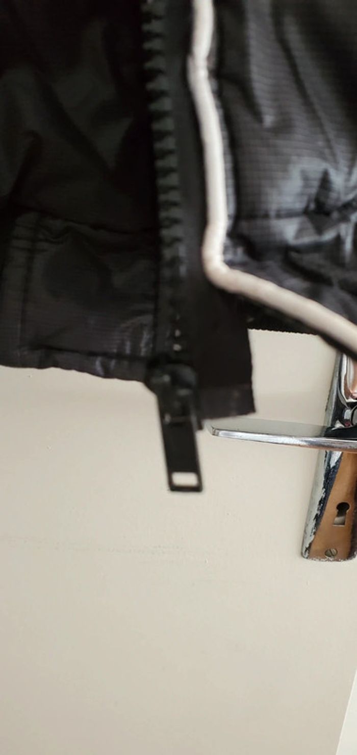 Souvent porter, voir photo 3 et 4 décousu un peu ou y a la fermeture mais n'empêche pas l'utilisation, la capuche peu s'enlever.