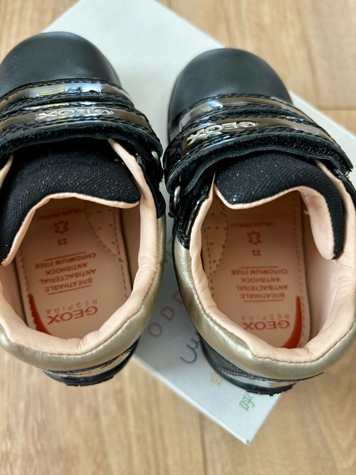 Vends chaussures Geox fillette taille 23 Couleur noire et or Valeur neuf : 45 euros Portées 1 fois Très bon état