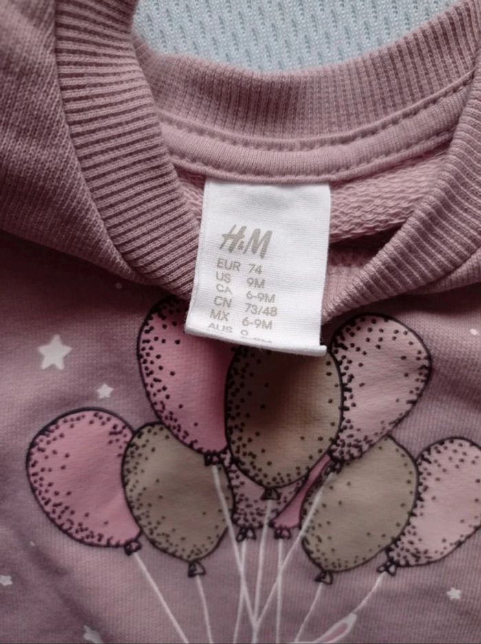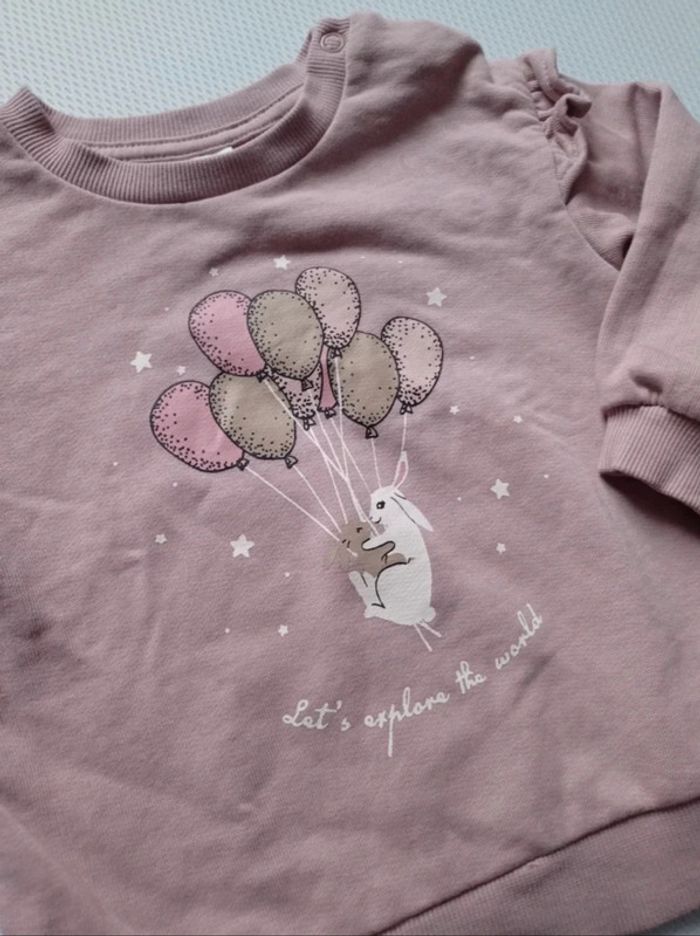 Sweat coton Vieux rose dessin lapins portés par des ballons Volants aux épaules Pressions épaule gauche H&M 12 mois