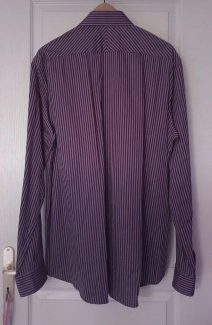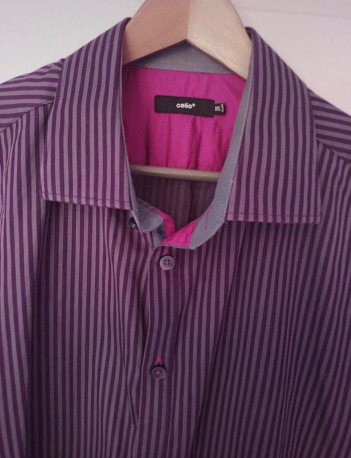 Chemise 100 % coton Réf Jabrille prune Grise rayée violet et lisseré fushia Largeur poignée réglable Étiquette taille XXL