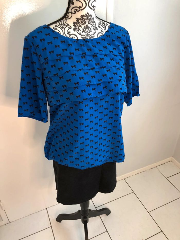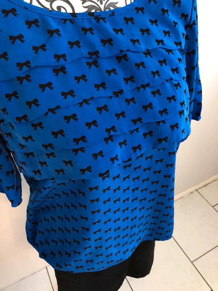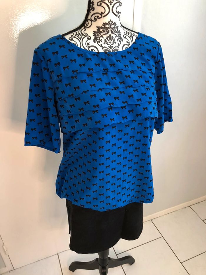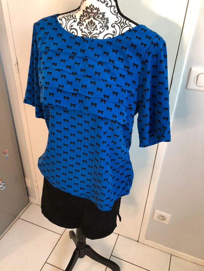 Top volanté Véro Moda a noeuds noirs. 3 rangées de volants à l’avant. Hyper confortable. Très agréable à porter Taille L correspond à un 40/42 Etat impeccable 🚨Pas d'envoi colissimo 🚨 #noeuds #top #blouse #noir #teeshirt #bleuélectrique #veromoda #bleu #adrymaillteeshirt #adrymaill40