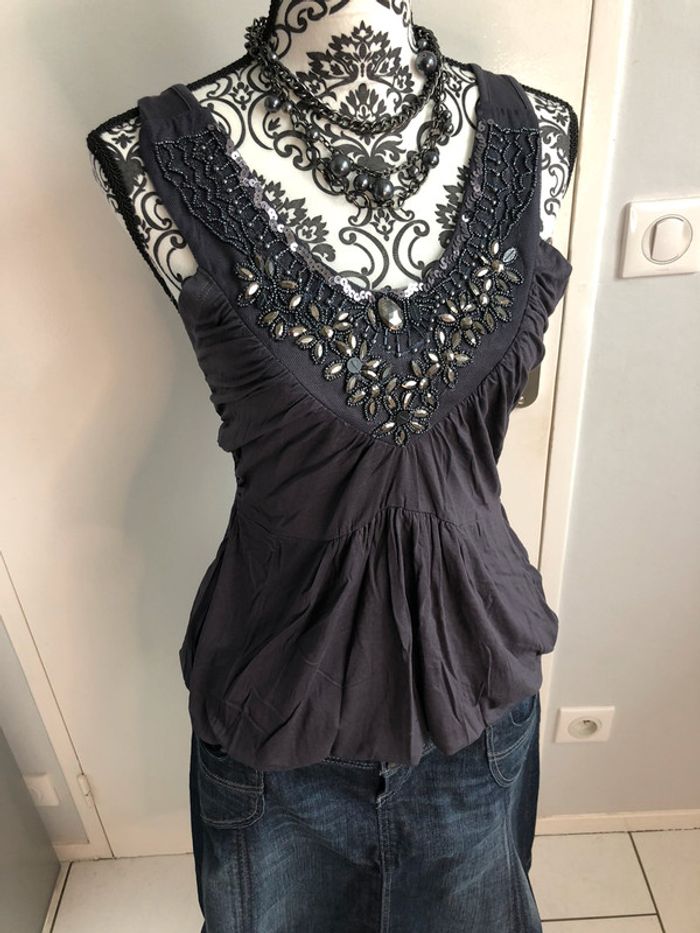 jamais porté bas resserré qui donne un effet blousant taille 38/40 mais correspond plus à un 40/42 aucune perle ni aucun sequin manquant comme neuf 🚨envoi de préférence par mondial relay, relais colis ou Chronopost 🚨 #adrymaill40 #adrymaillteeshirt #strass #perles #gris #decolletté 🚨envoi de préférence par mondial relay, relais colis ou chronopost🚨 #top #gris #sequins #perles #debardeur