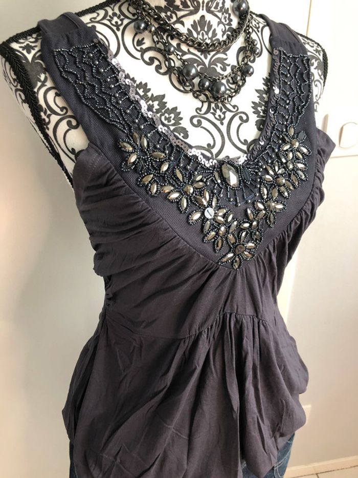 Débardeur gris foncé col V à sequins et perles 3 suisses