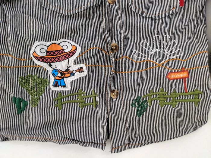 Chemise Tom et Kiddy fines rayures blanches et noires avec broderie et écusson souris