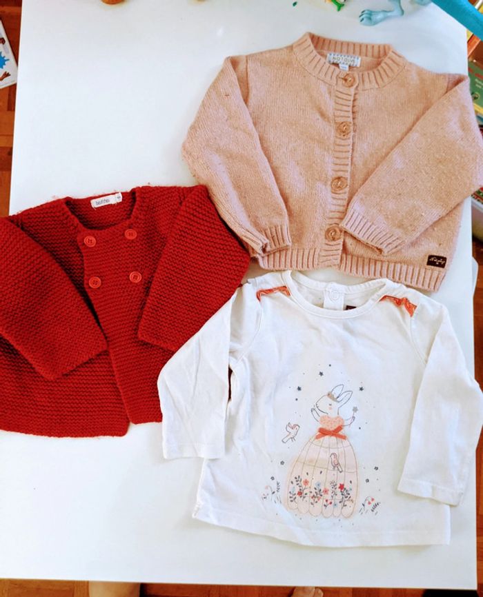 Ensemble 3 pièces 2 gilets tricoté maille et blouse Sergent Major 6 mois 67 cm Très bon état, porté quelques fois mais reste très joli Gilet rose clair 7% cachemire 5% angora Natalys 6 mois, quelques fines bouloches Gilet coton et 15% laine bien épaisse rouge Bout'Chou 6 mois Tee-shirt blouse tunique lapin et fleurs avec fines paillettes, neuf, jamais porté. Sergent major 6 mois #yipin_bebe_6mois_fille #yipin_bebe_6mois