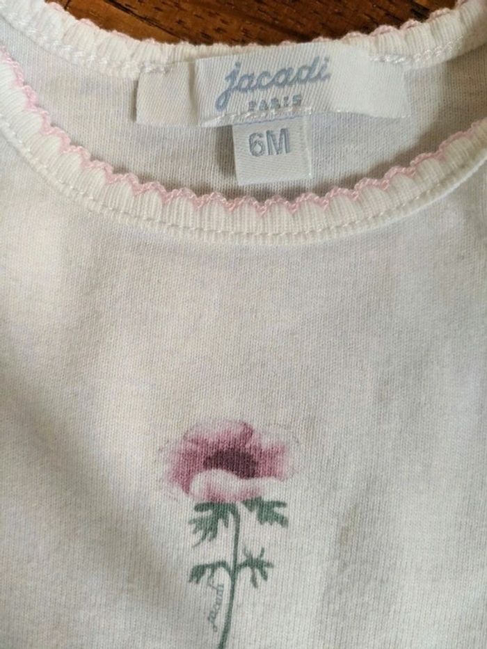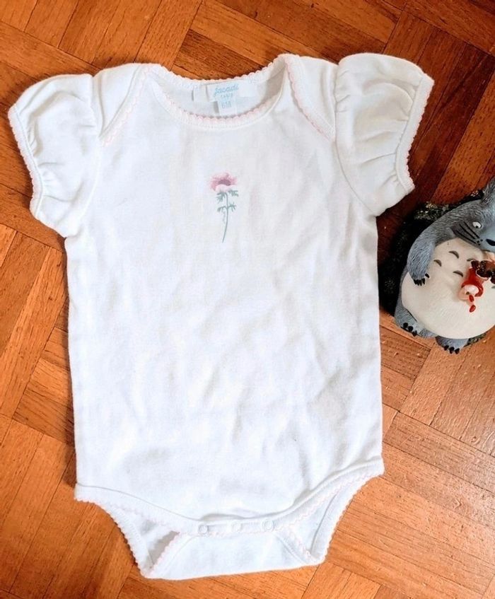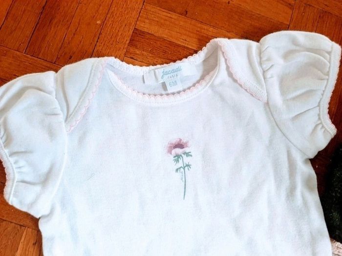 Body coton blanc épais festons dentelle rose Jacadi 6 mois Neuf jamais porté Jolie fleur devant Jolies manches courtes un peu froncées 6 mois Jacadi #yipin_bebe_6mois_fille